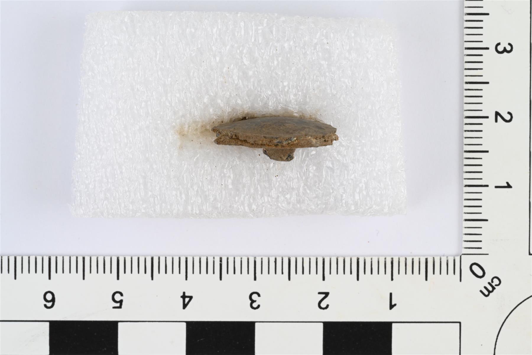 | Litteähkö nappi, etupuoli hieman kupera. Taustapuolelta murtunut kanta. Reunat murtuneet. | |