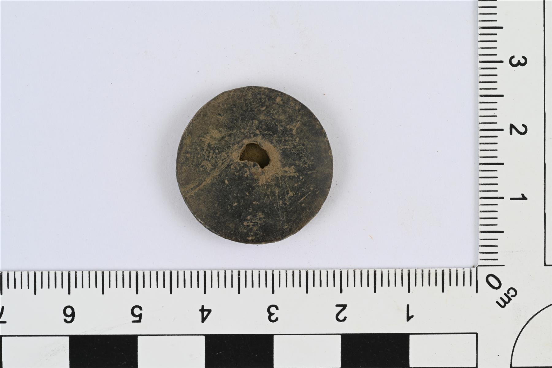 | Ontto litistynyt nappi, etu- ja taustapuoli olleet kuperat. Taustapuolella reikä kohdassa, josta murtunut kanta. | |