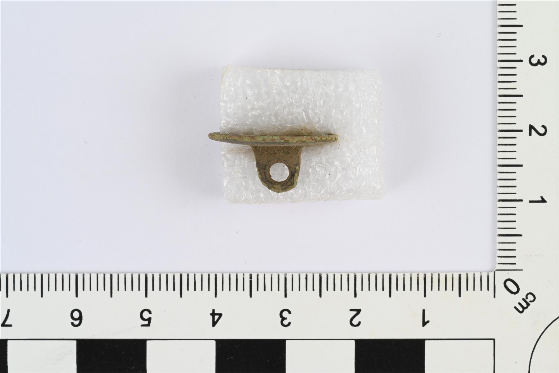 | Koristeltu nappi. Litteä, etupuoli hieman kovera, taustapuolella kanta. Etupuolella sileän reunuksen keskellä reliefikuvio, jossa aaltoviivojen muodostama ristikuvio. | |