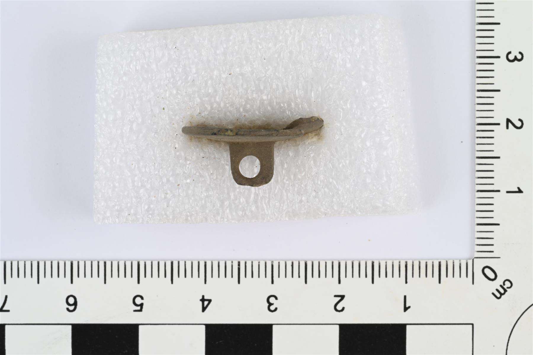| Koristeltu nappi, ns. kansanpuvun nappi. Litteä, etupuoli hieman kovera, taustapuolella kanta. Etupuolella reliefikoristeluna helminauhareunus ja keskellä kukkakuvio. Reuna murtunut. | |