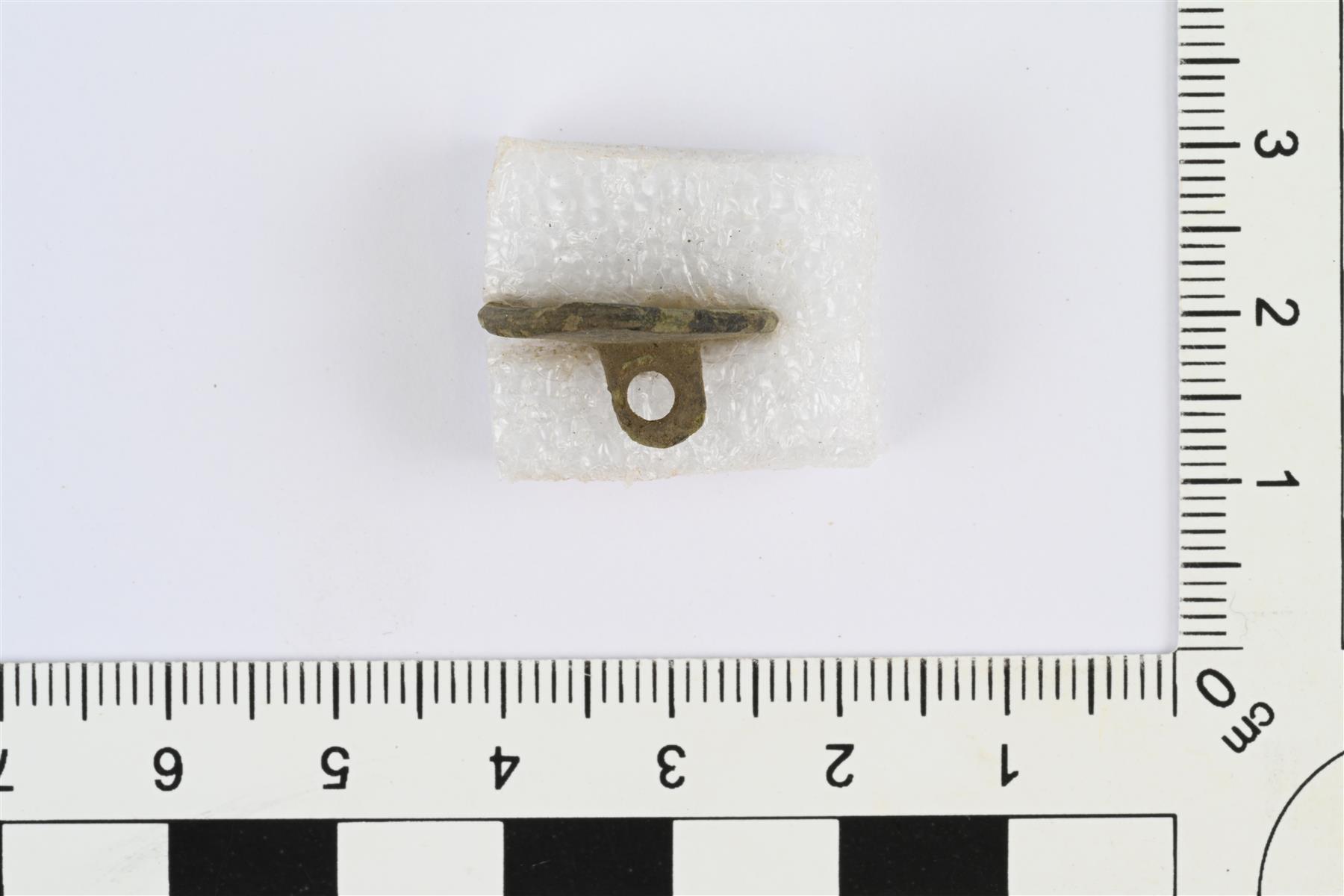 | Koristeltu nappi. Litteä, etupuoli hieman kovera, taustapuolella kanta, joka vinossa eikä aivan keskellä nappia. Etupuolella reliefikoristeluna pienistä vinoviivoista koostuva nyörimäinen reunus. | |