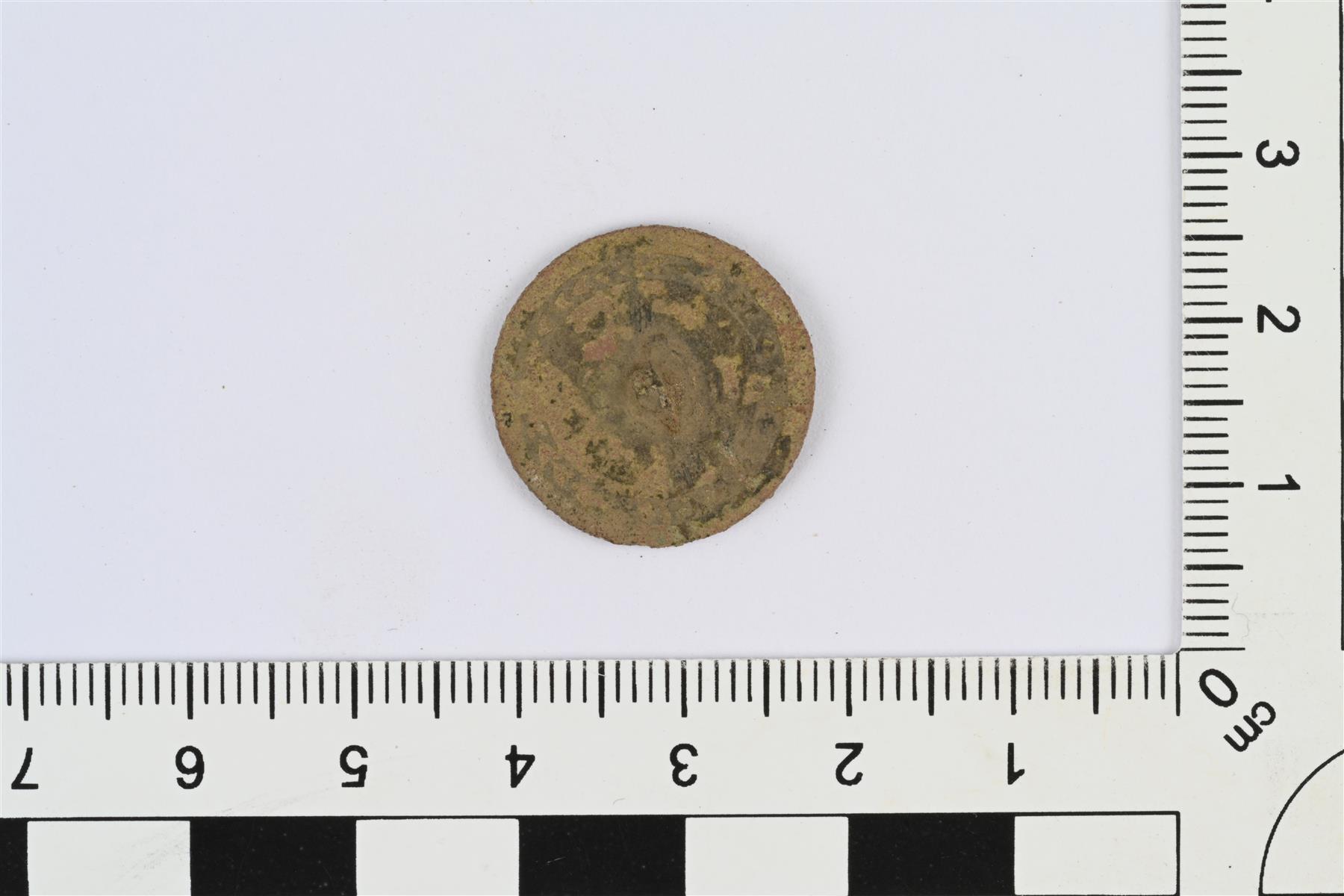 | Koristeltu nappi. Litteä, taustapuolelta murtunut kanta. Etupuolella jälkiä koristelusta, ainakin nyöri- tai helminauhareunuksesta. Taustapuolella reunan sisäpuolella kehä, jossa mahdollisesti tekstiä. Pinnat huonokuntoiset. | |