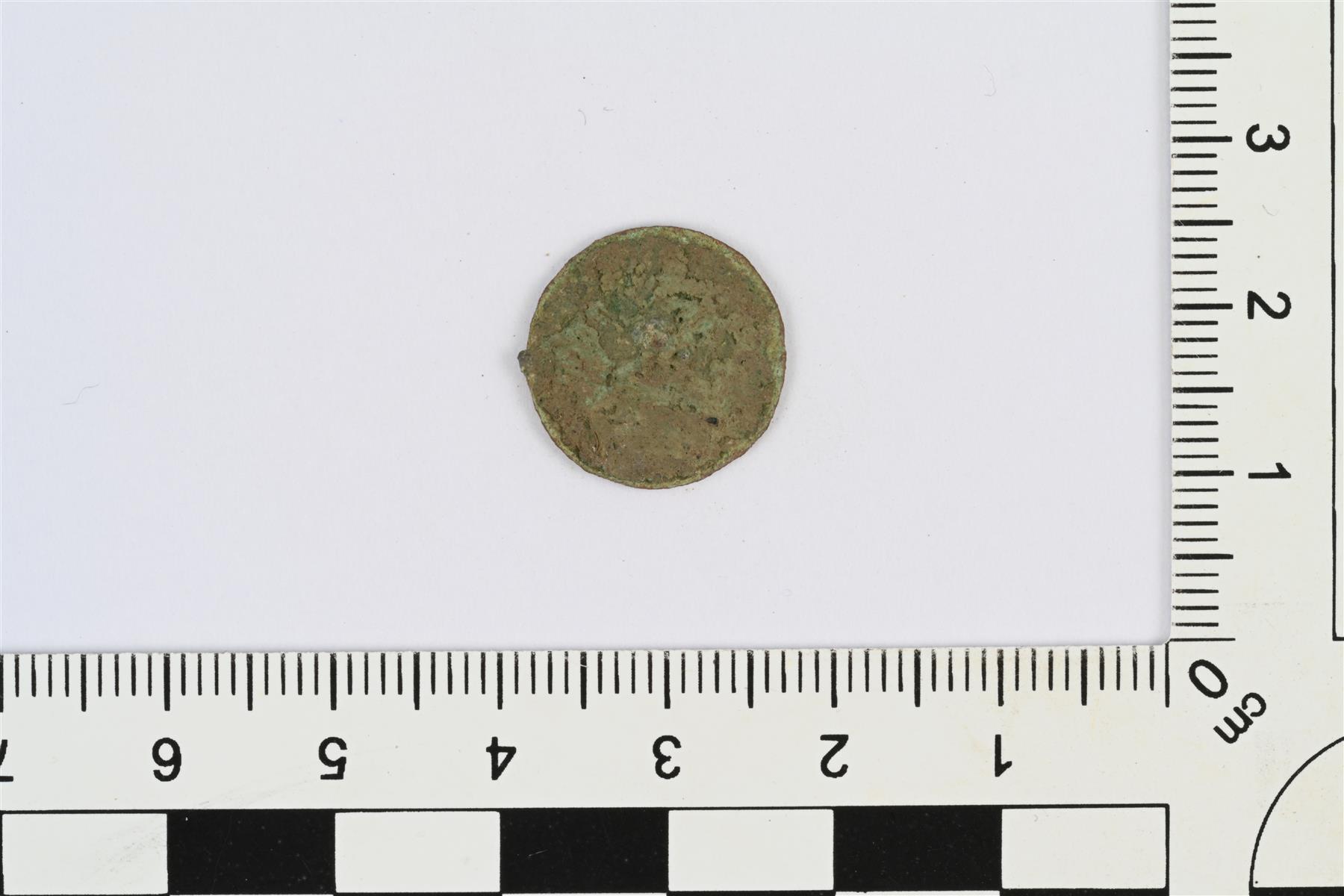| Koristeltu nappi. Litteä, taustapuolelta murtunut kanta. Etupuolella epäselvää reliefikoristelua. Pinta huonokuntoinen. Mahdollisesti samanlainen kuin nappi KM 46770:85. | |