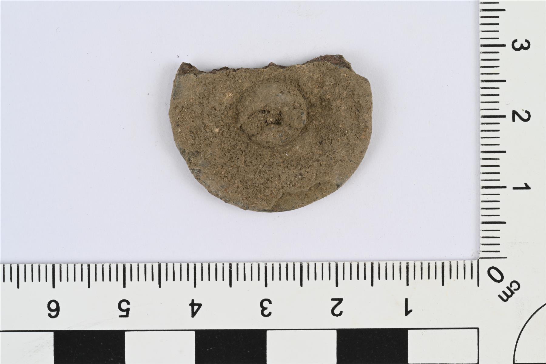 | Litteä nappi. Taustapuolelta murtunut kanta. Levyosan reunasta murtunut suuri pala. | |