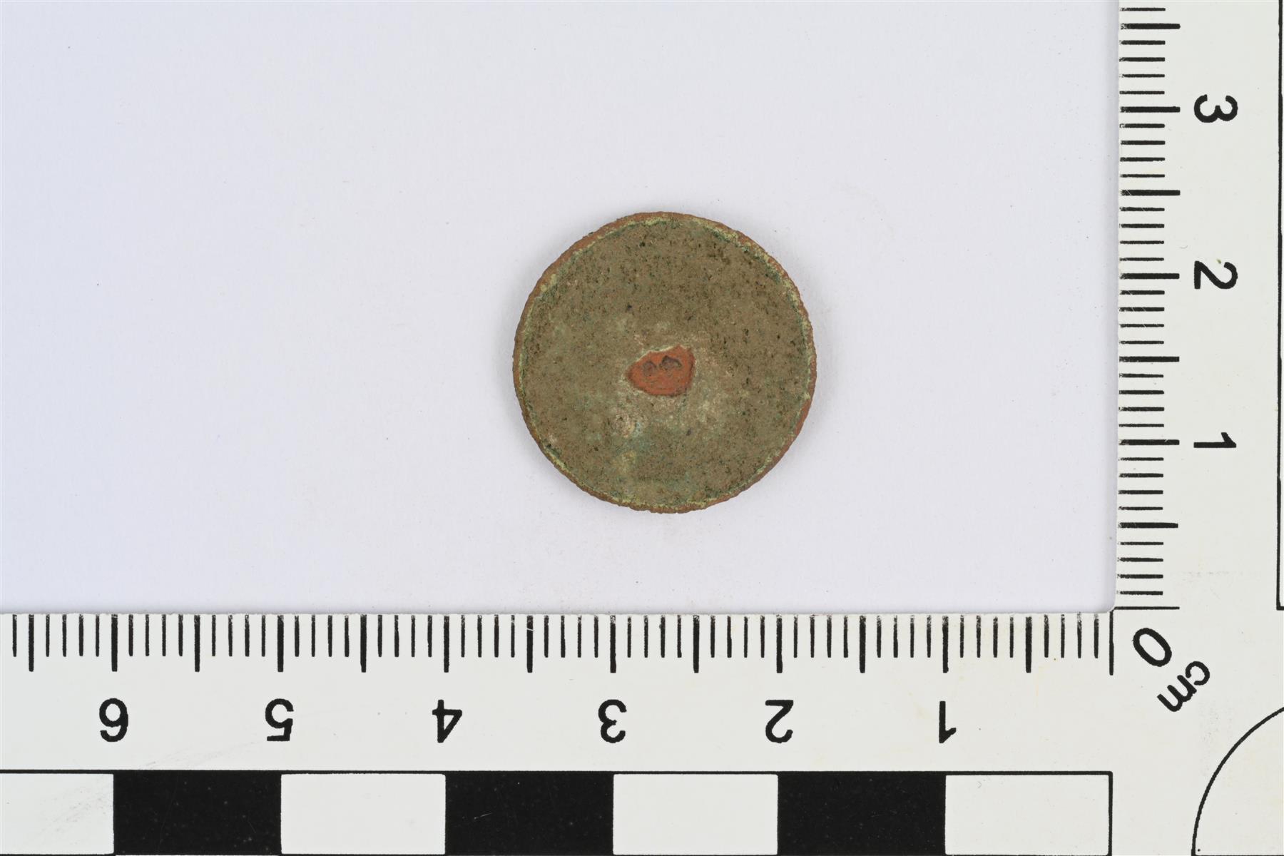 | Litteä nappi. Taustapuolelta murtunut kanta. | |