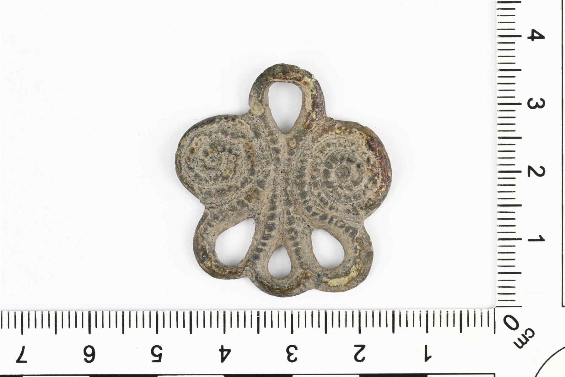 | Kokonaisena säilynyt ja hyväkuntoinen ketjunkantaja. Yläosassa on yksi ripustuslenkki ja alaosassa on kolme rinnakkaista lenkkiä. Sivuilla on pyöreät korvakkeet, joissa on spiraalikuviot. Muina koristeluina on poikittaisia viivauurteita. Vrt. Kivikoski Abb. 767 ja 1110. | |