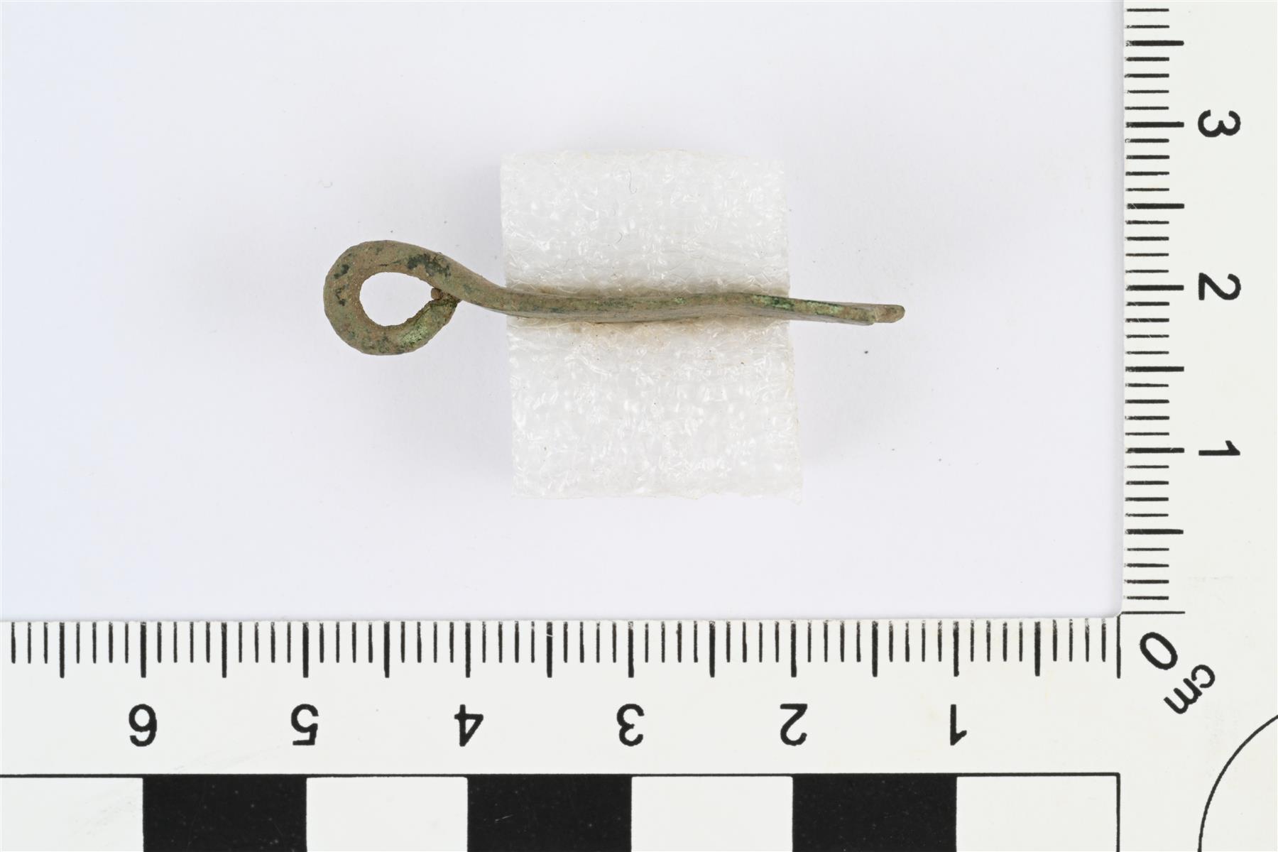 | Ompelukoukun katkelma. Katkelma pitkänomaisesta litteästä esineestä, jonka ehjä pää kapeneva ja taivutettu lenkiksi. | |