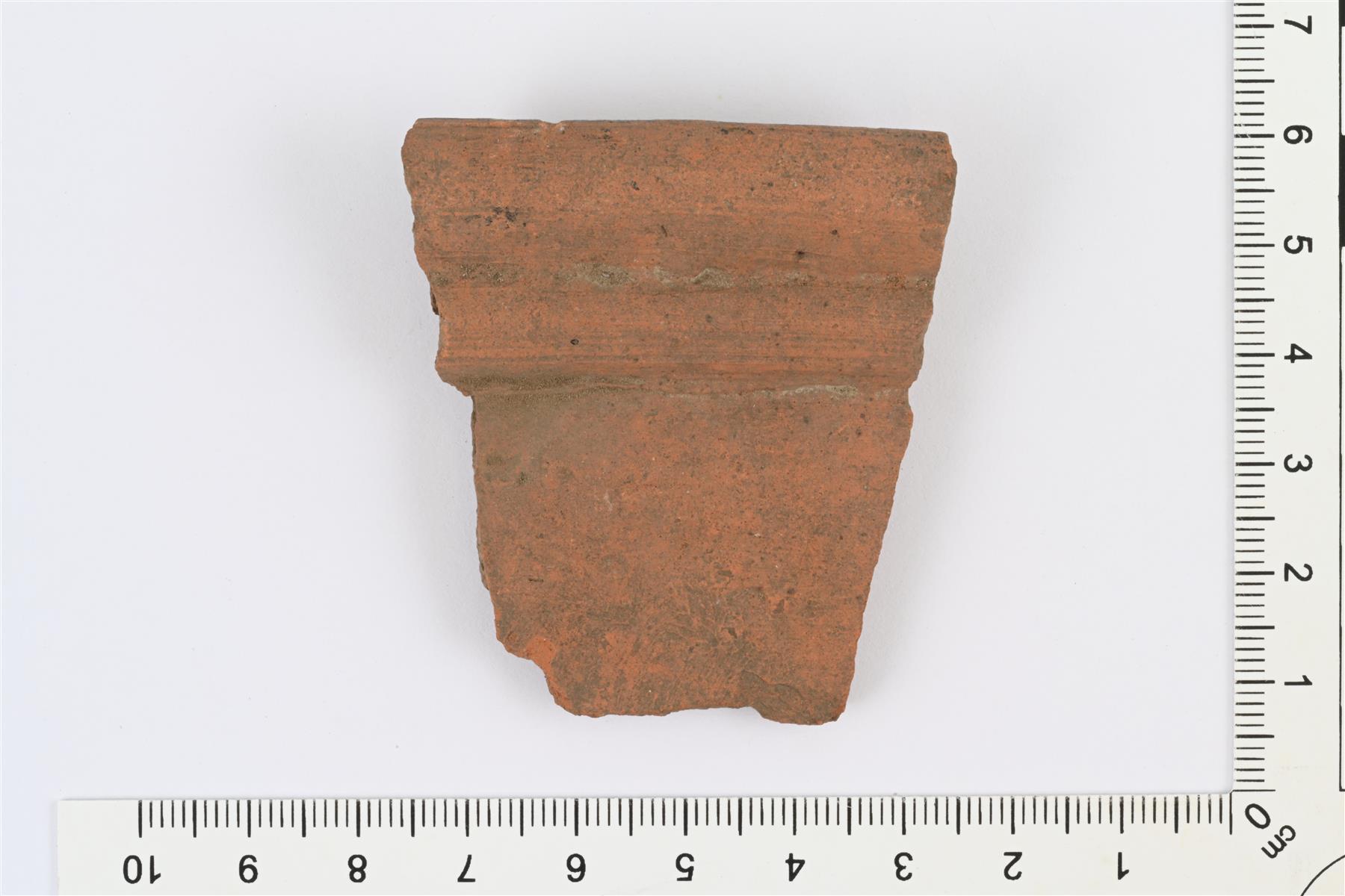 | Suureunapala ruukusta tms. Reuna ulkopinnalta profiloitu. Sisäpinnalla kellanruskea lyijylasite. | |