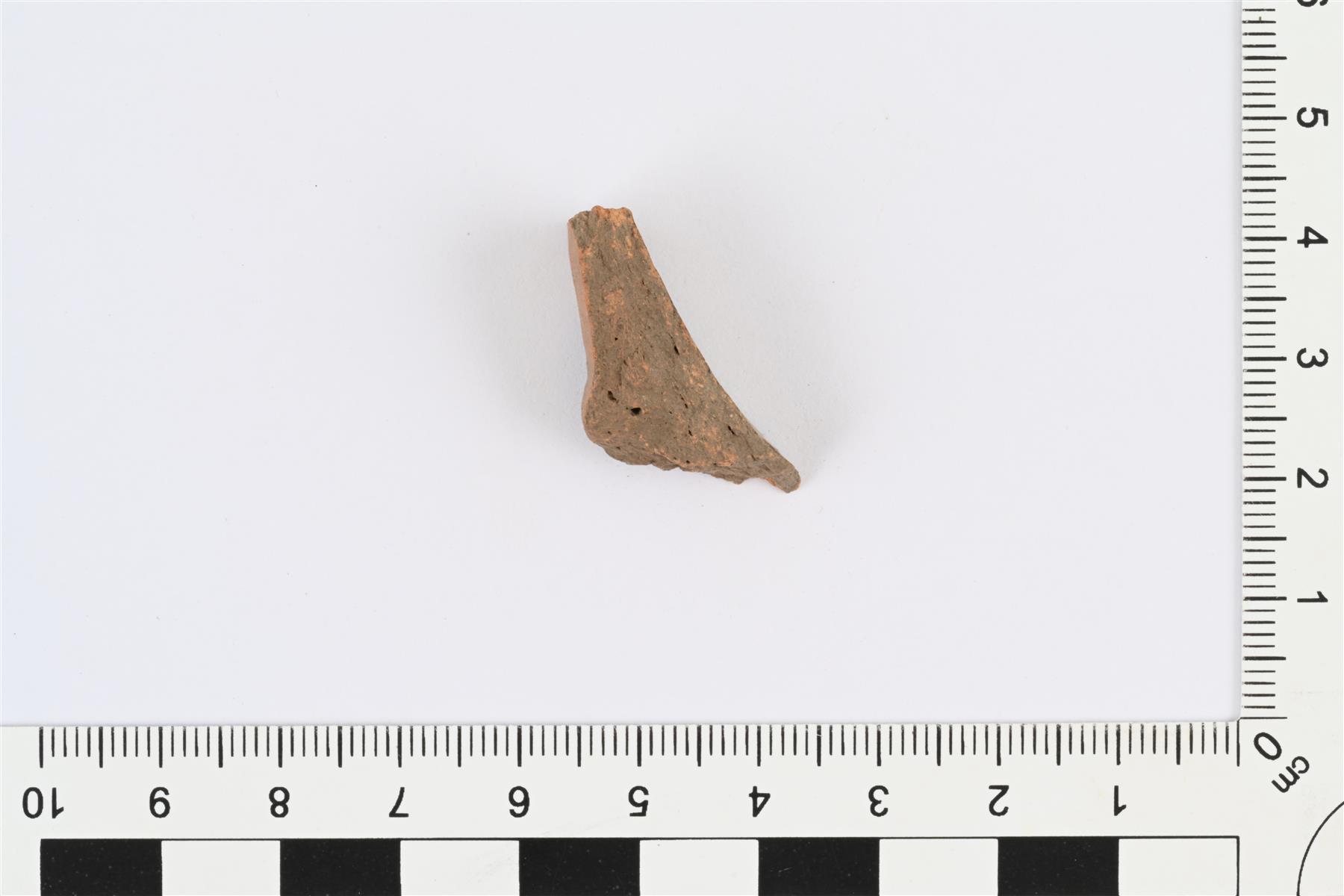 | Mahdollinen pohjareunapala. Ulkopinta lohjennut pois. Sisäpinnalla kellanruskea lyijylasite. | |