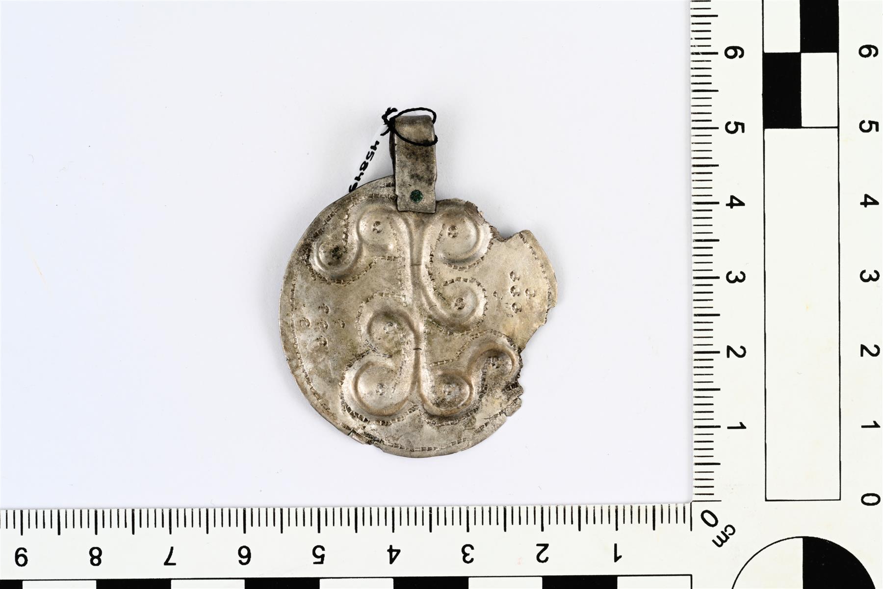 | Ohuesta hopealevystä tehty riipus. Muodoltaan pyöreä. Reuna on paikoin murentunut. Ohuesta levystä tehty ripustuslenkki on niitattu kiinni. Koristeluna taustapuolelta pakotettua köynnösornamentiikkaa. Lisäksi häränsilmä- ja pisteviivakoristelua. Vrt. Kivikoski Abb. 1130. | |