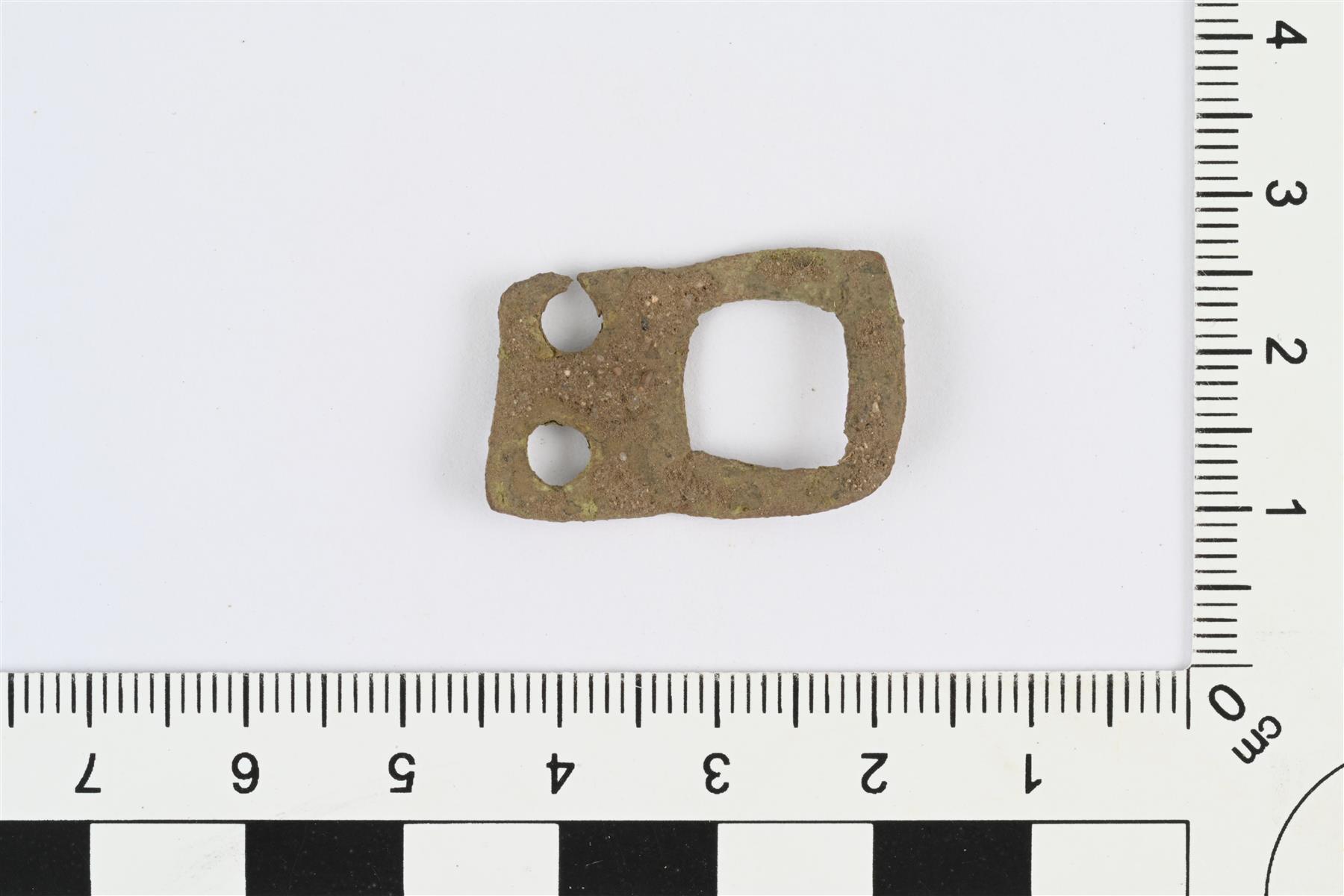 | Luultavasti vyön- tai hihnansolki. Pieni suorakulmion muotoinen kehä, jonka toisessa päässä neliönmuotoinen reikä ja toisessa päässä kaksi pientä pyöreää reikää. | |