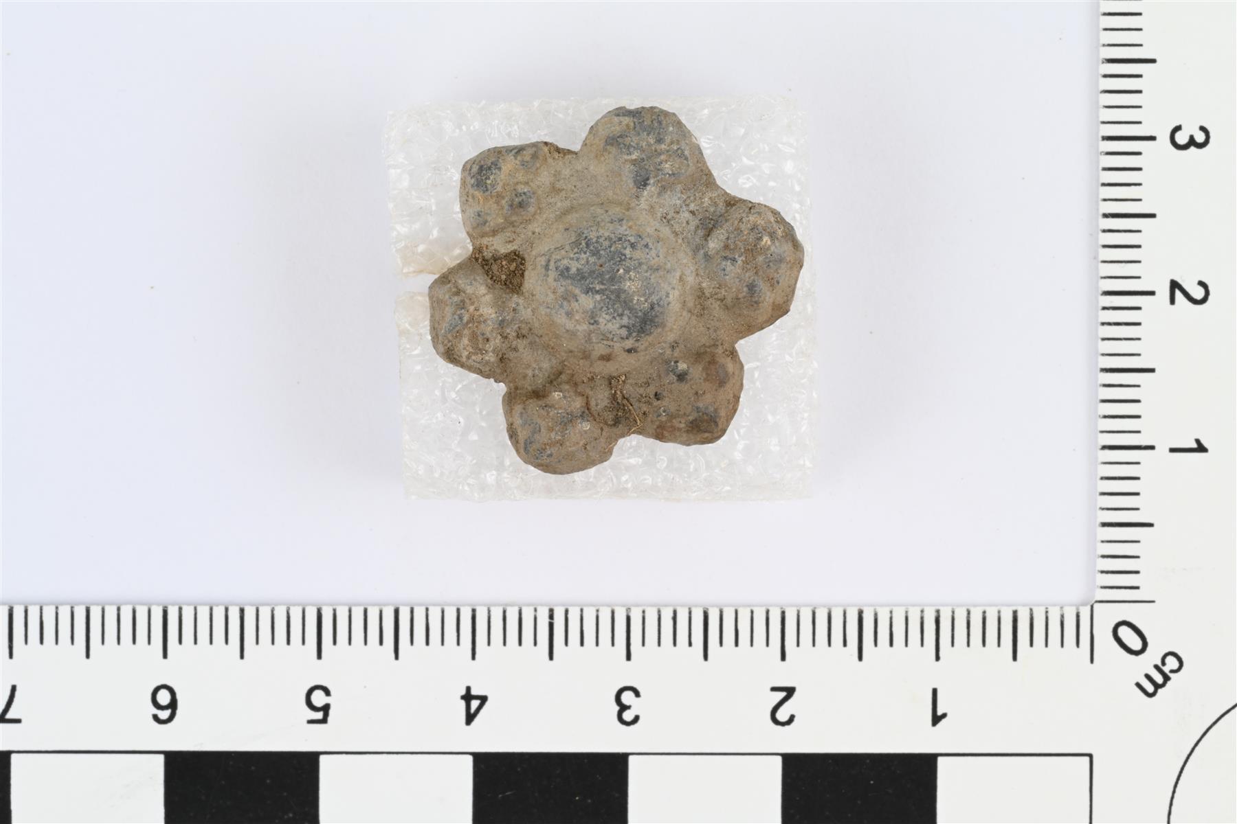 | Kukanmuotoinen vyön- tai hihnanhela tai valjaskoriste. Kukassa keskellä pyöreä kuhmu ja sen ympärillä kuusi terälehteä, joissa jokaisessa vinoneliön muodossa neljä pientä kohopalloa. Taustapuolella valusauma ja kiinnitystappi. | |