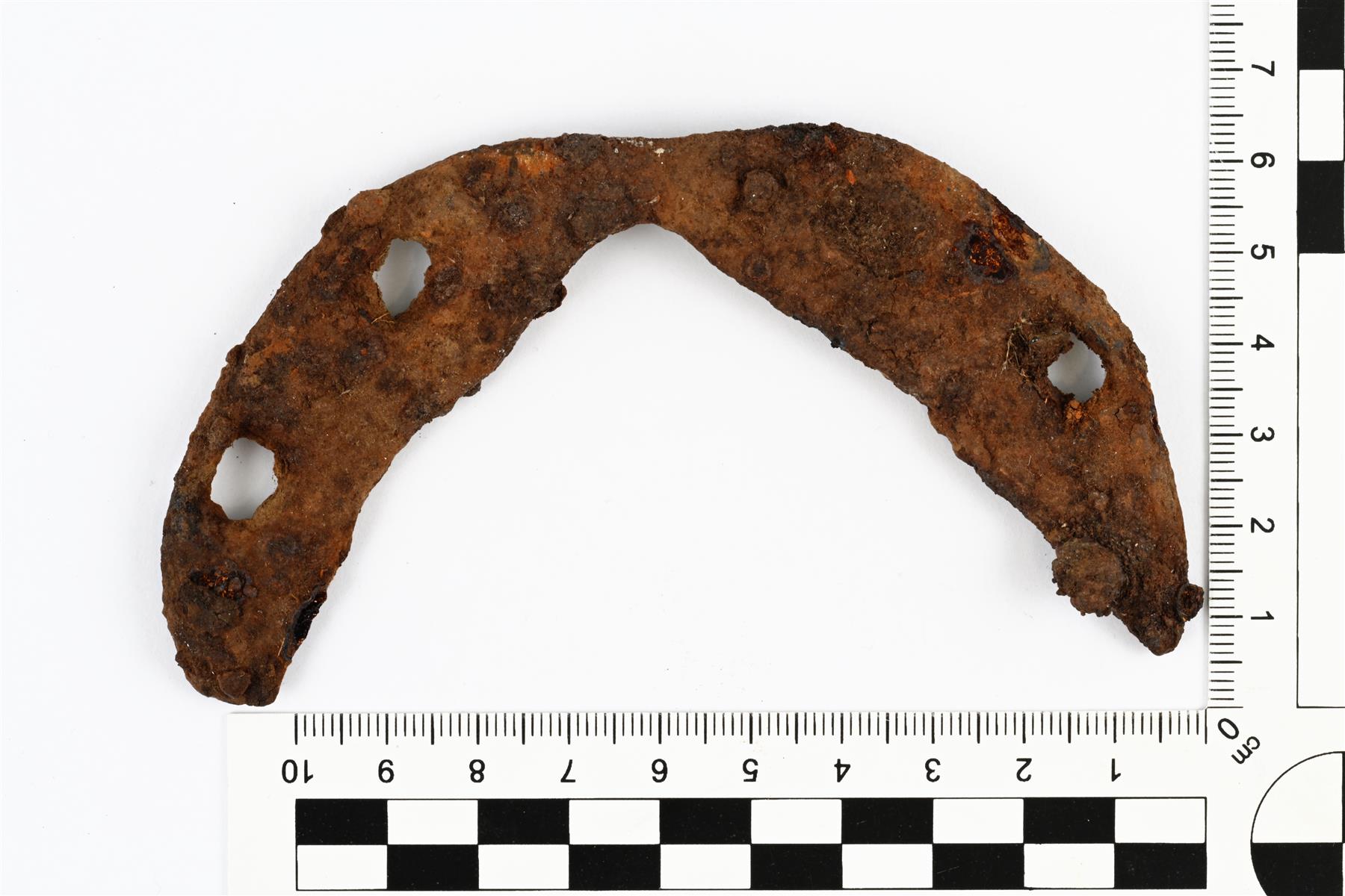 | Hevosenkengän etuosa. Päädyt puuttuvat. Kummallakin sivulla on kaksi neliömäistä reikää, joista toisella puolella olevista yksi on ruostunut umpeen. Etuosa on kulunut. Kaaren sisäpuoli muodostaa V:n mallisen kulman. | |