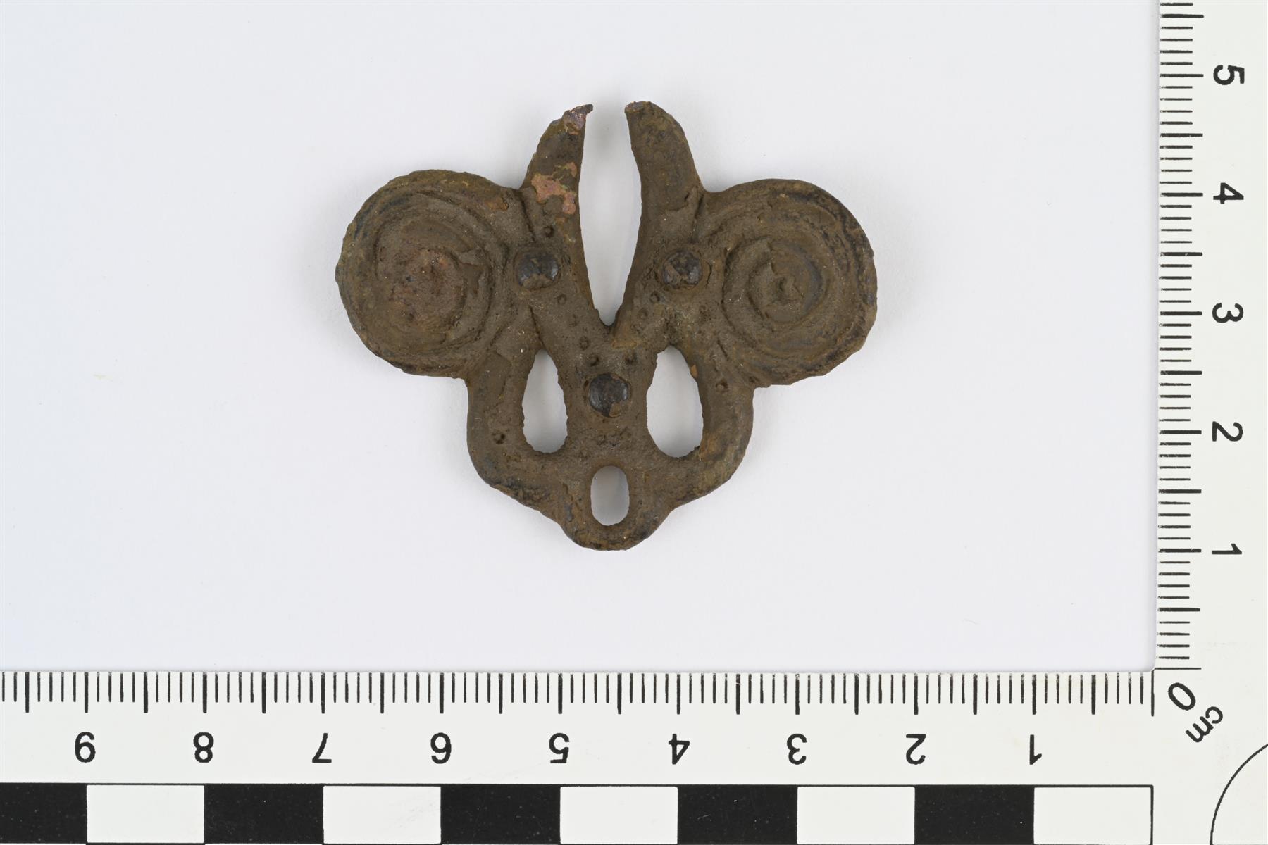 | Spiraalipäinen ketjunkantaja. Yläpään lenkki murtunut. Etupuolella pistekoristelua ja kolme tappia. | |