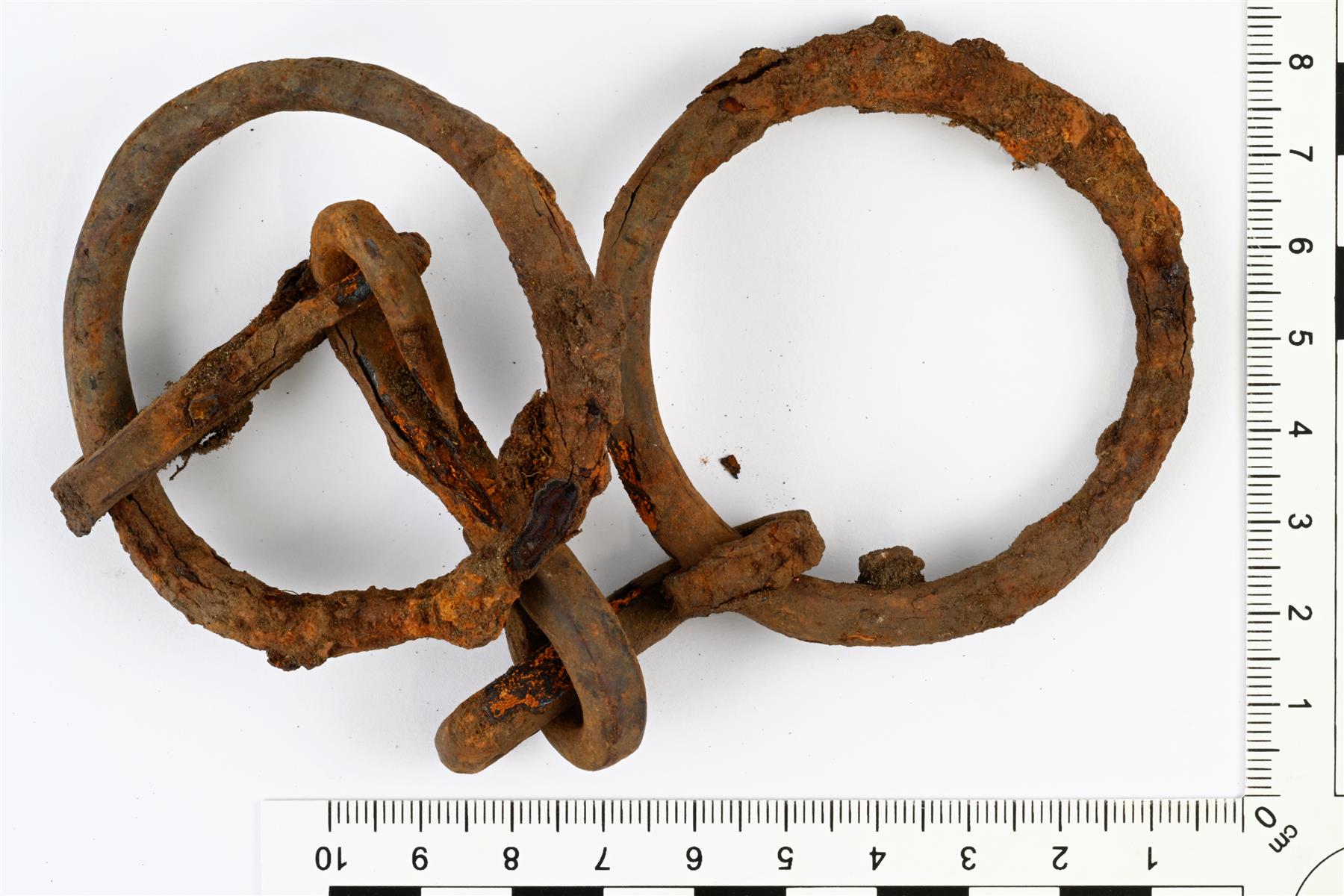 | Kokonaisena säilynyt kolmipalakuolain. Nivelet on kierretty S-malliseksi. Nivelten vartaiden poikkileikkaus on neliömäinen ja ne ohenevat päitä kohti. Päissä olevat renkaat ovat pyöreät. Renkaiden vartaiden poikkileikkaus on pyöreä. Vrt. Kivikoski Abb. 999 ja Härmä kuva 1. | |