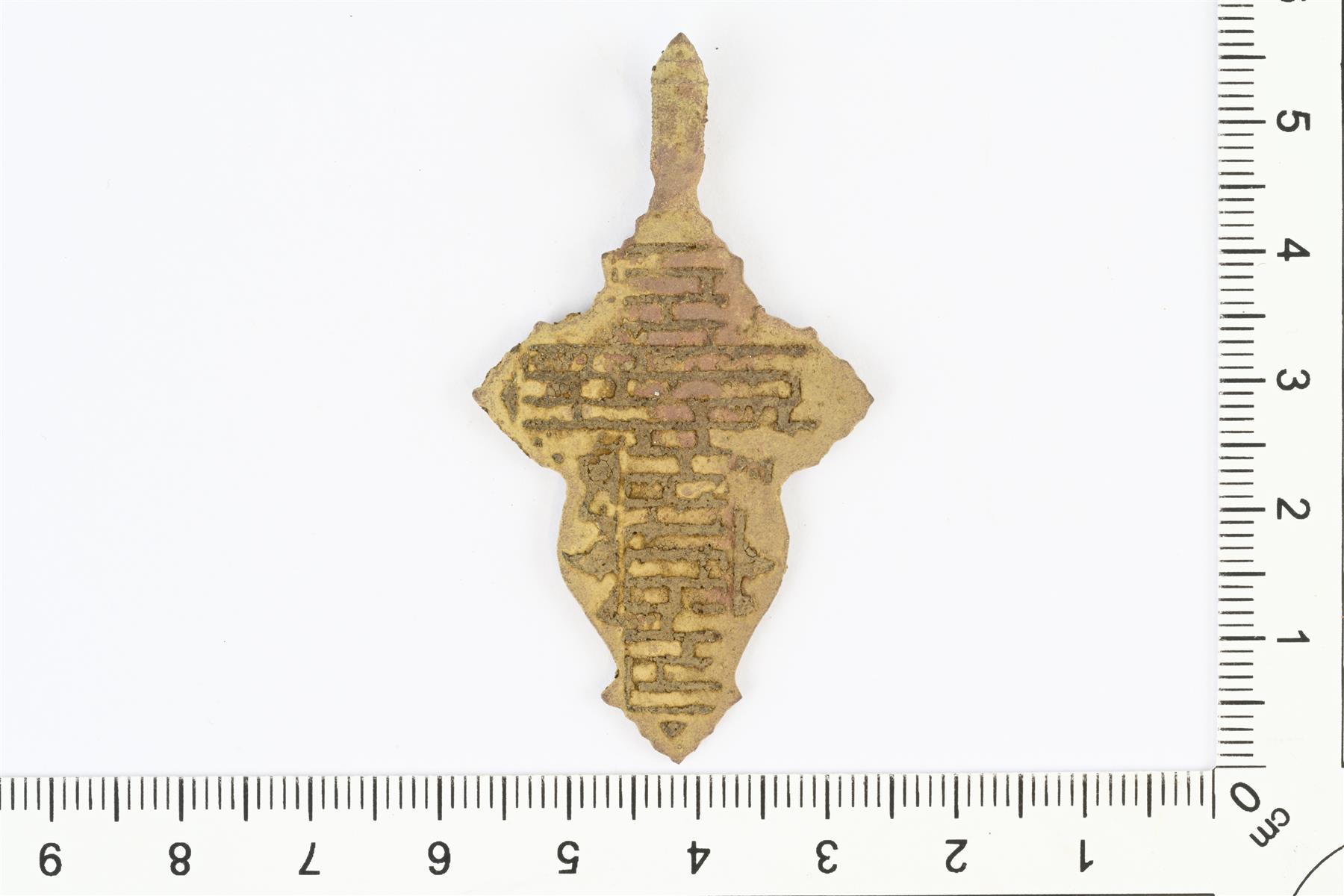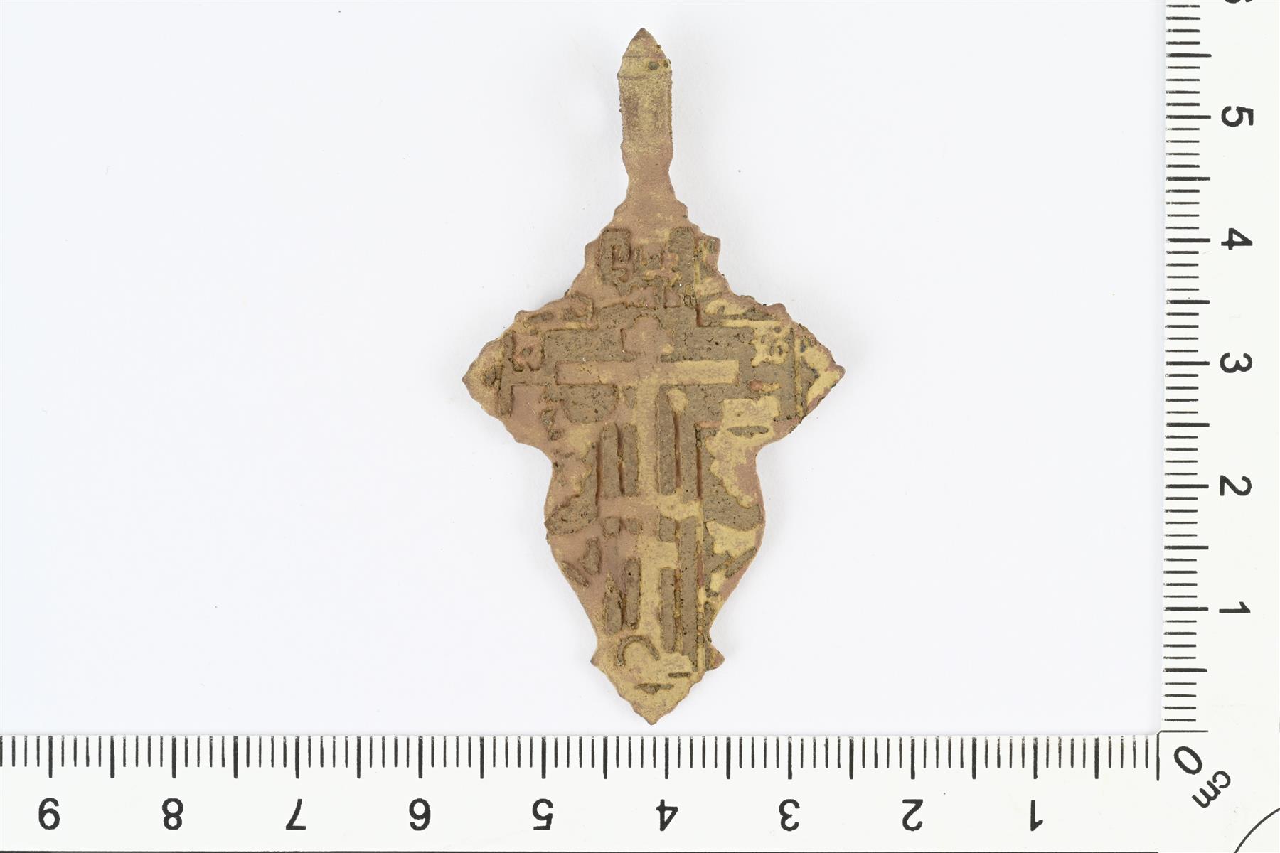 | Ristiriipus, ortodoksinen kasteristi. Vanhauskoisten risti. Sakarat leveät, pyöristetyt ja päihin suippenevat. Molemmilla puolilla reliefikoristelua, etupuolella mm. ortodoksinen risti. Yläpäässä ripustuslenkki. Vrt. Jeckel 1999, s. 174-177, Abb. 101, 105-106. | |