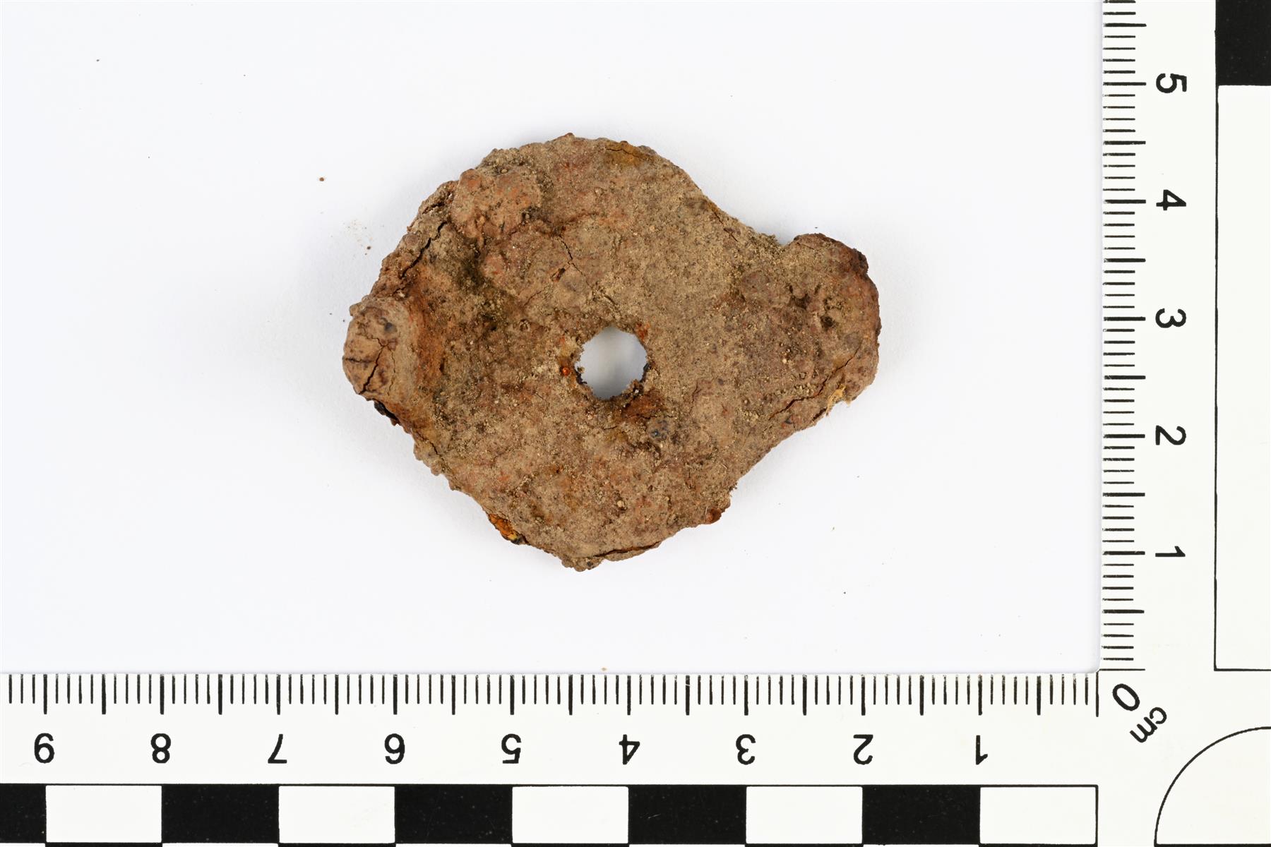 | Mahdollinen kaksipiikkinen viskari tai kattilankorvan katkelma. Muodoltaan pyöreä ja toisessa reunassa on pitkänomainen uloke. Keskellä on reikä (niittausreikä kattilaan?). | |