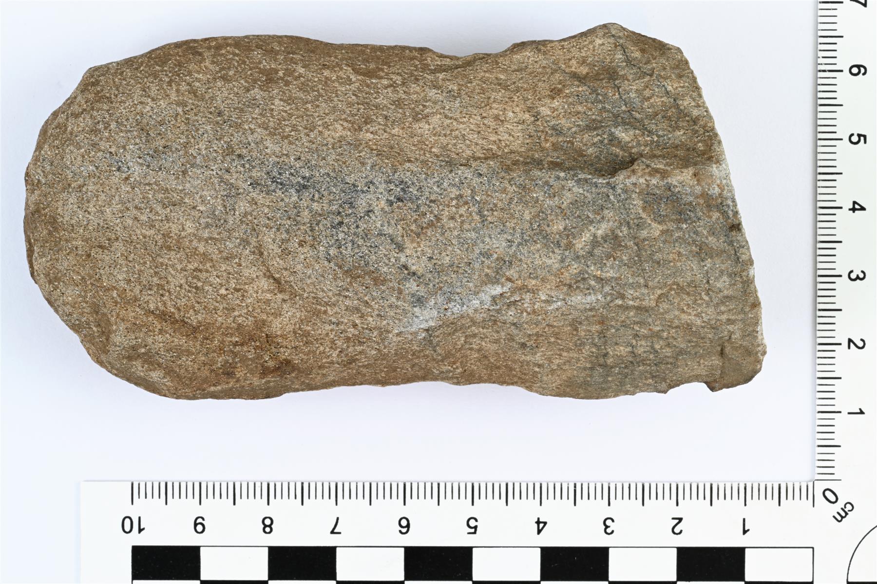 | Mahdollinen kivikirveen teelmän katkelma. Kiveä on raakatyöstetty. Poikkileikkaus on ovaali. | |