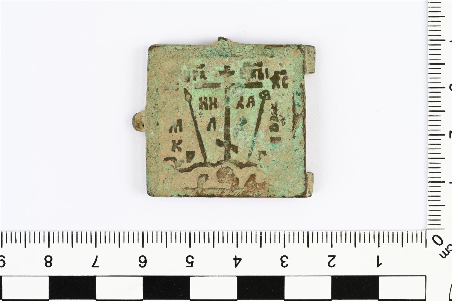 | Matkaikonin puolikas. Kansi puuttuu. Etupuolella on kuvattuna kolme pyhimyskehällä varustettua hahmoa ja taustalla on sinistä emalointia. | |