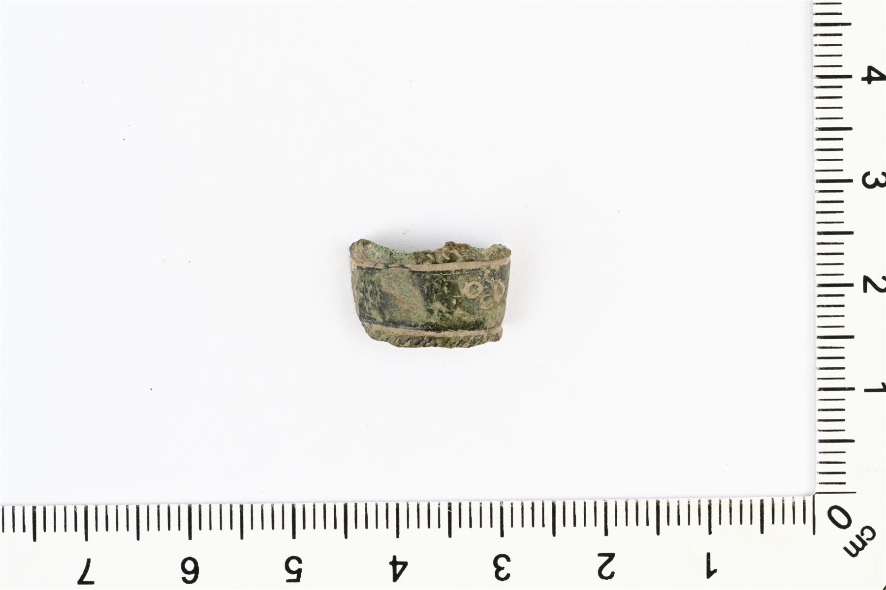 | Sormuksen katkelma. Keskellä on koristeluna häränsilmäleimoja. reunoilla on viivauurteet ja vinoviivakoristelua. | |