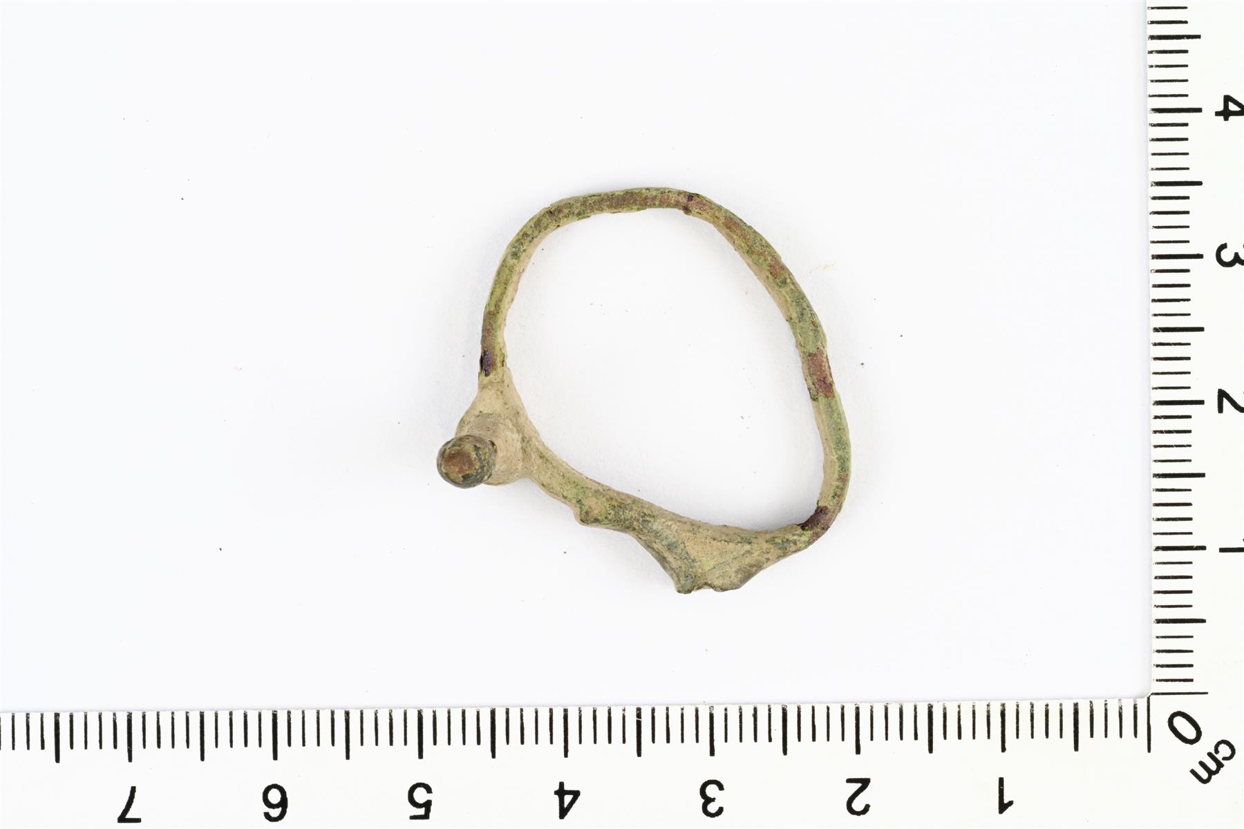 | Pyöreä koriste-esine, jonka kehästä lähtee tappimainen varras. Mahdollisesti kynttiläsaksien katkelma. | |