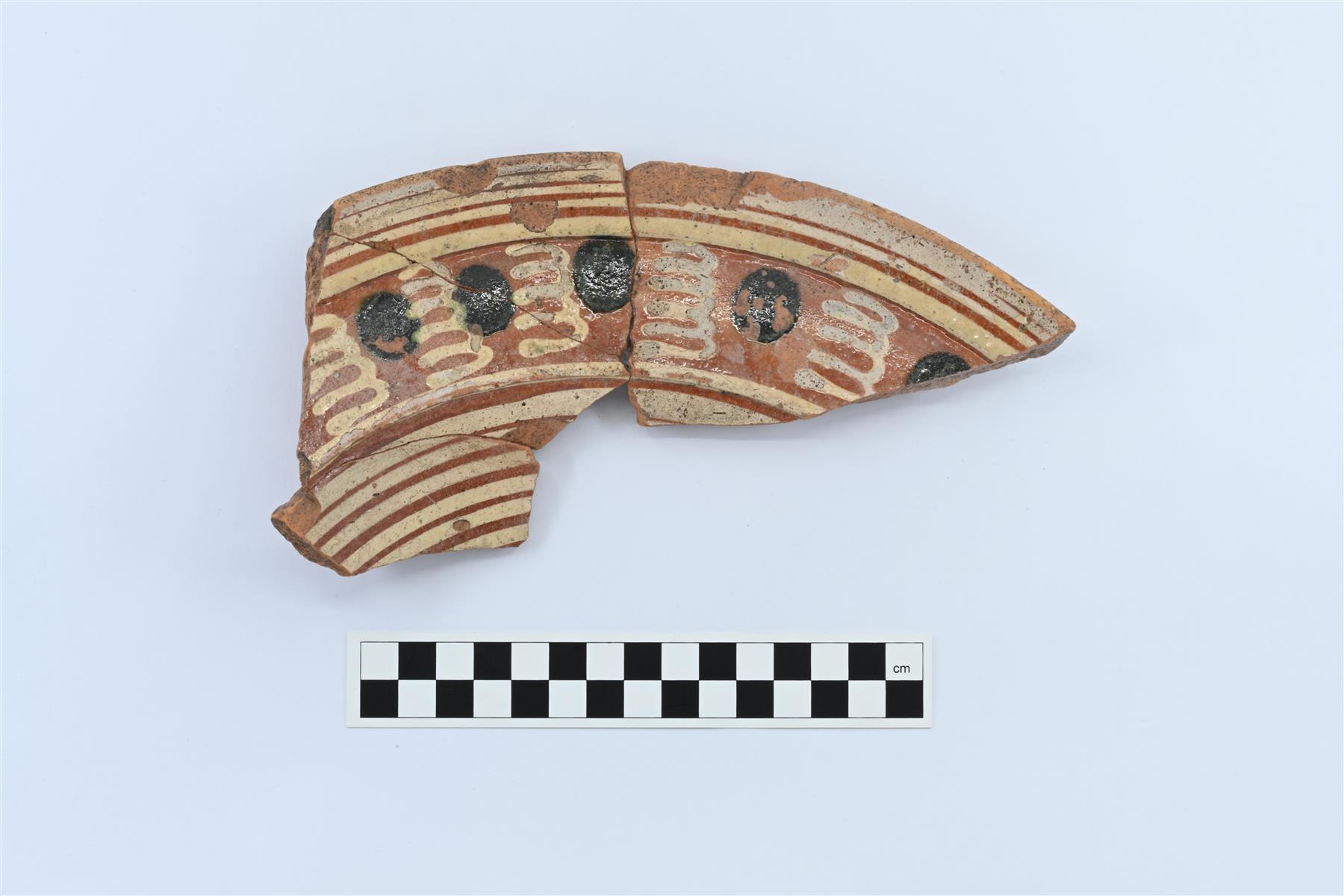 | Reuna- ja kylkipaloja boluskoristeisesta vadista. Palat yhteensopivia ja liimattu yhteen. Reunan ulkopinnalla paksunnos. Sisäpinnalla valkosaviraitoja reunassa ja kyljessä, niiden välissä reunan lierissä vuorotellen kiemuraisia valkosavikuvioita ja vihreitä pallokuvioita. Sisäpinnalla myös väritön lyijylasite. Astian suun halkaisija noin 350 mm. | |