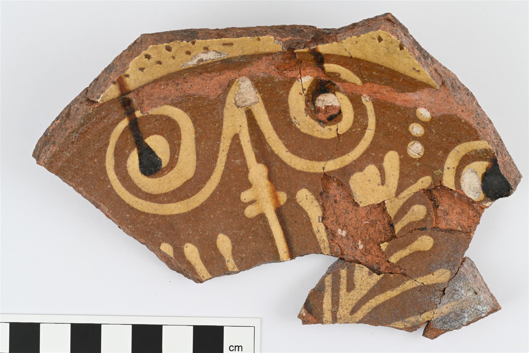 | Pohja- ja kylkipaloja boluskoristeisesta vadista tai kulhosta. Palat yhteensopivia ja liimattu yhteen. Pohjareuna kevyesti profiloitu. Kyljen ulkopinnalla kohovyö. Sisäpinnalla pohjassa ja kyljen alaosassa runsasta, mahdollisesti kasviaiheista valkosavikoristelua, jonka päällä paikoin tummanruskeaa väriä. Ylempänä kyljessä vyöhyke valkosavilietettä, johon uurrettu hemring-koristelua. Sisäpinnalla myös väritön lyijylasite. | |