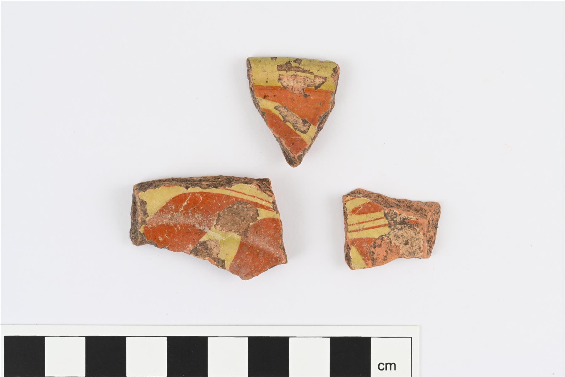 | Boluskoristeisen vadin suureunapala ja kylkipaloja, luultavasti samasta astiasta. Reunan ulkopinnalta lohjennut paksunnos. Sisäpinnalla reunassa valkosaviraita ja alempana muita valkosavikuvioita, sekä väritön lyijylasite. | |