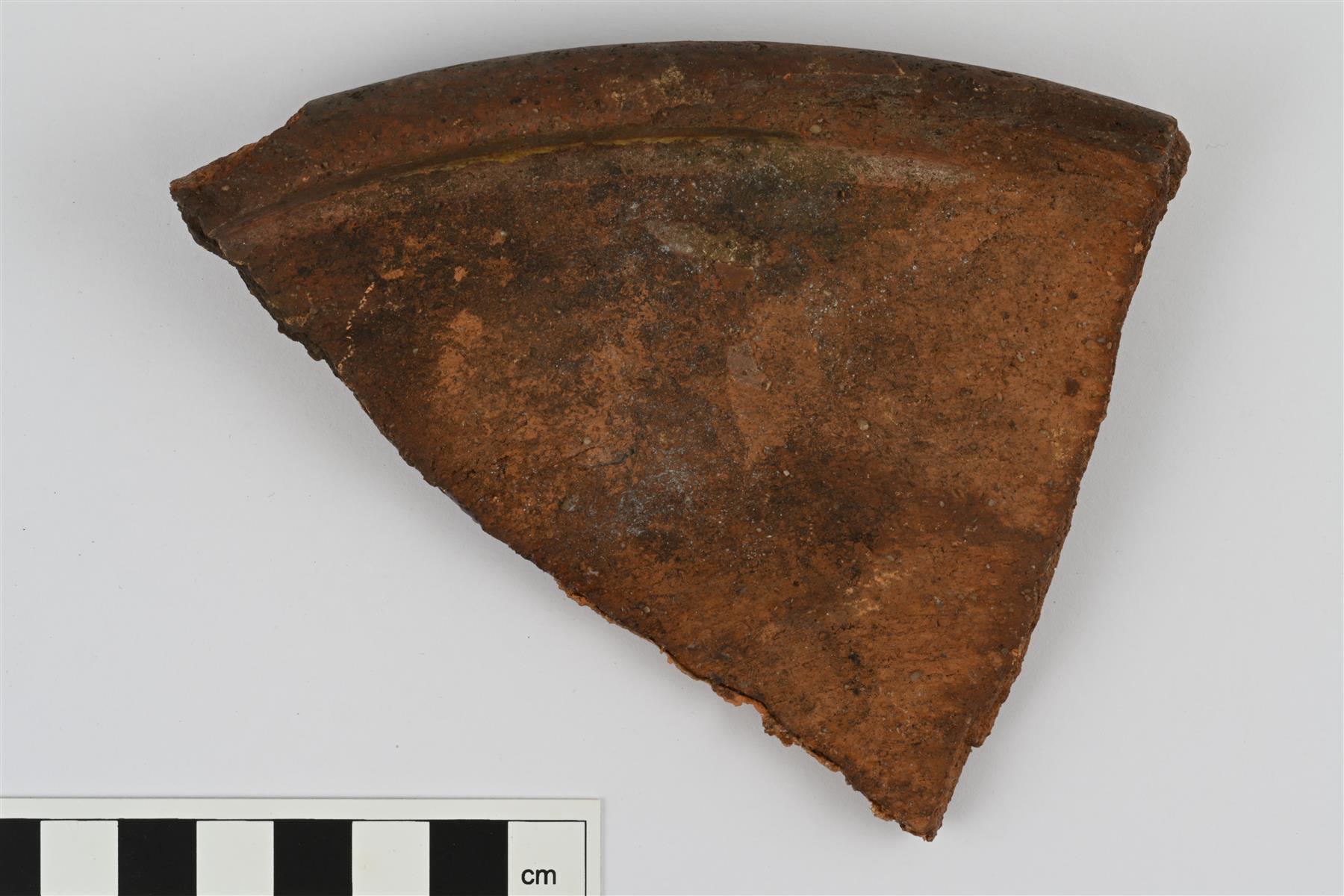 | Boluskoristeisen vadin suureunapala. Reuna sisäänpäin kiertyvä, ulkopinnalla paksunnos. Sisäpinnalla rippeitä valkosaviraidoista ja värittömästä lyijylasitteesta. Astian suun halkaisija noin 320 mm. | |