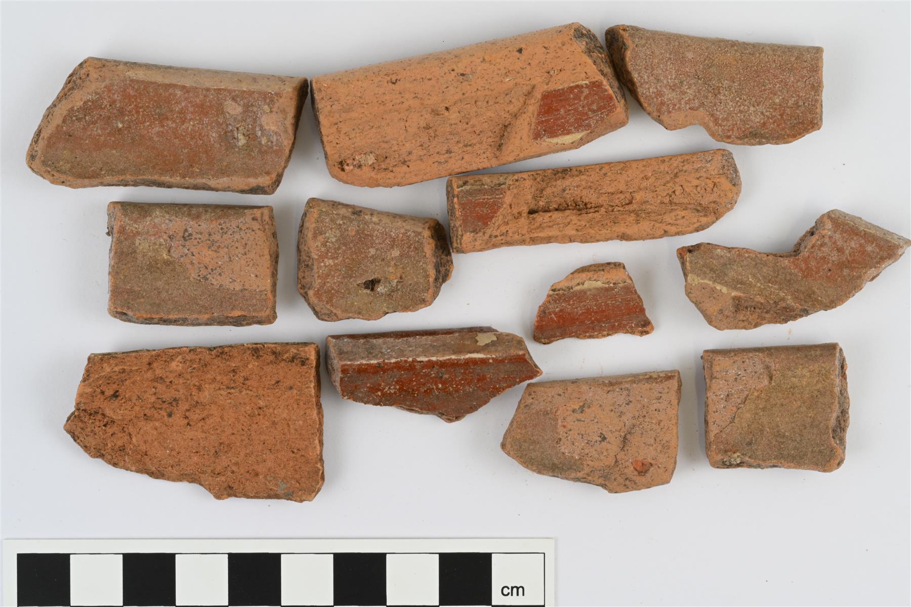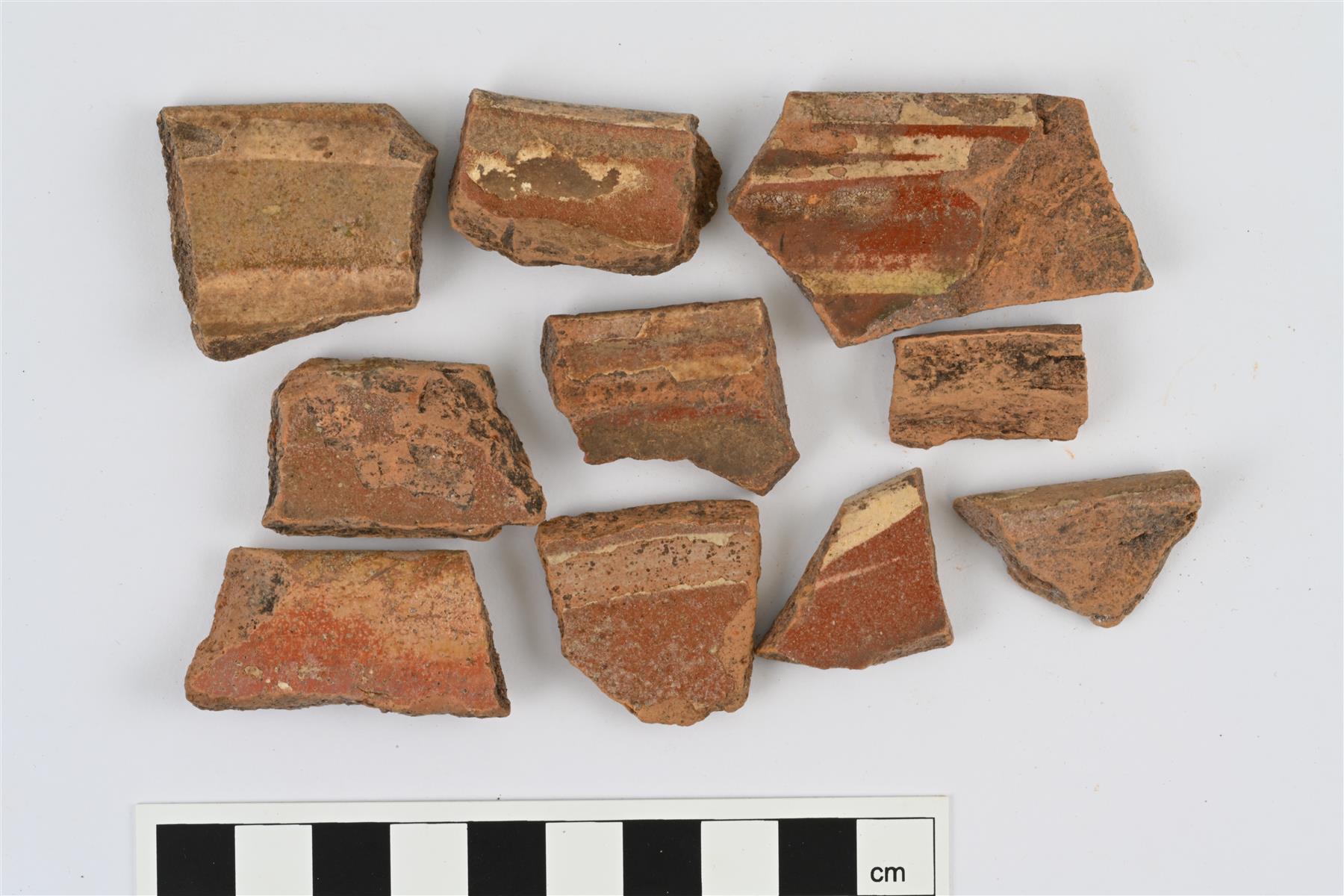 | Boluskoristeisten kulhojen suureunapaloja, eri astioista. Reunat ulkopinnalta profiloitu. Sisäpinnalla valkosaviraitoja ja väritön lyijylasite. | |