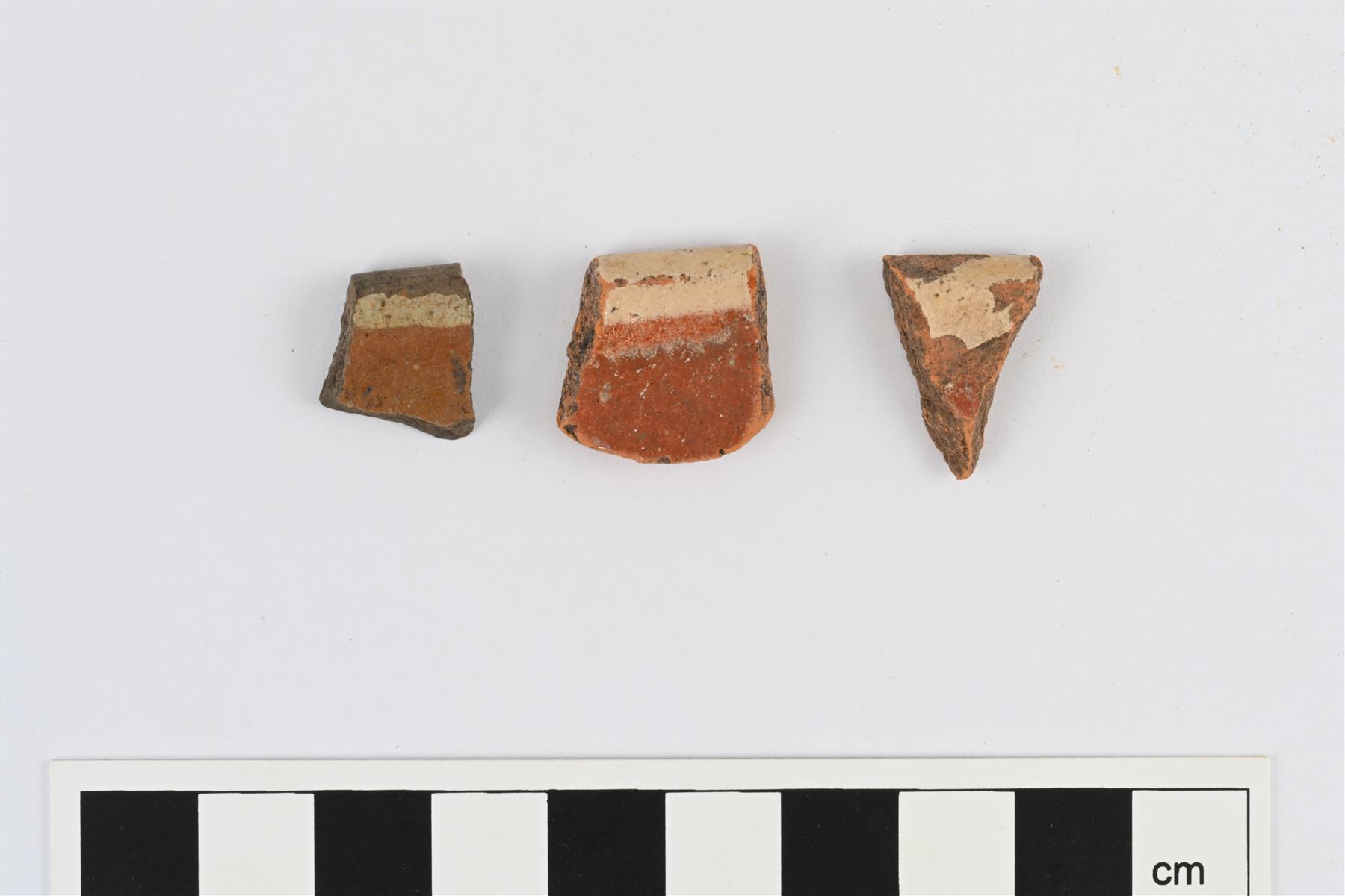| Valkosavikoristeisten kulhojen suureunapaloja, eri astioista. Reunat sirot ja ohuet. Ulkopinnalla yhtenäinen valkosaviliete, joka jatkuu sisäpinnalle reunaan raidaksi, molemmilla pinnoilla väritön lyijylasite. | |