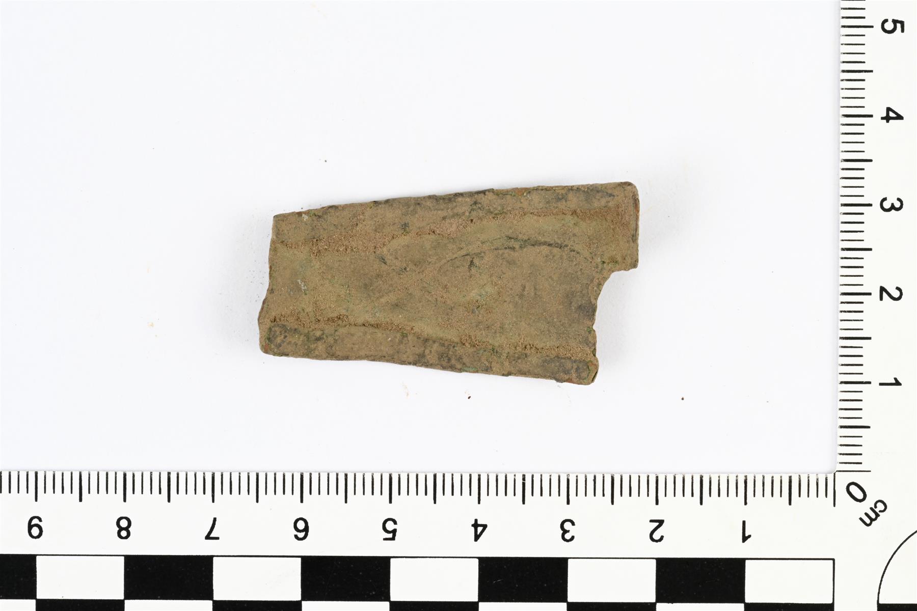 | Toiseen päähän kapenevan kupariseospellin katkelma. Ehjät reunat on taitettu sisäänpäin kaksinkerroin. | |