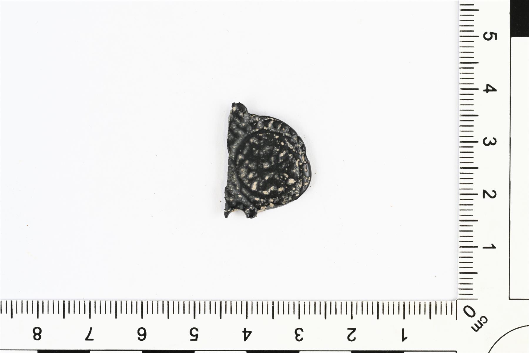 Ketjunkantajan pyöreän korvakkeen katkelma. Reunoja kiertää kohopisteiden muodostama koristekuvio. Keskellä on huonosti erottuvia kuoppakuvioita. Vrt. Kivikoski Abb. 768. | |