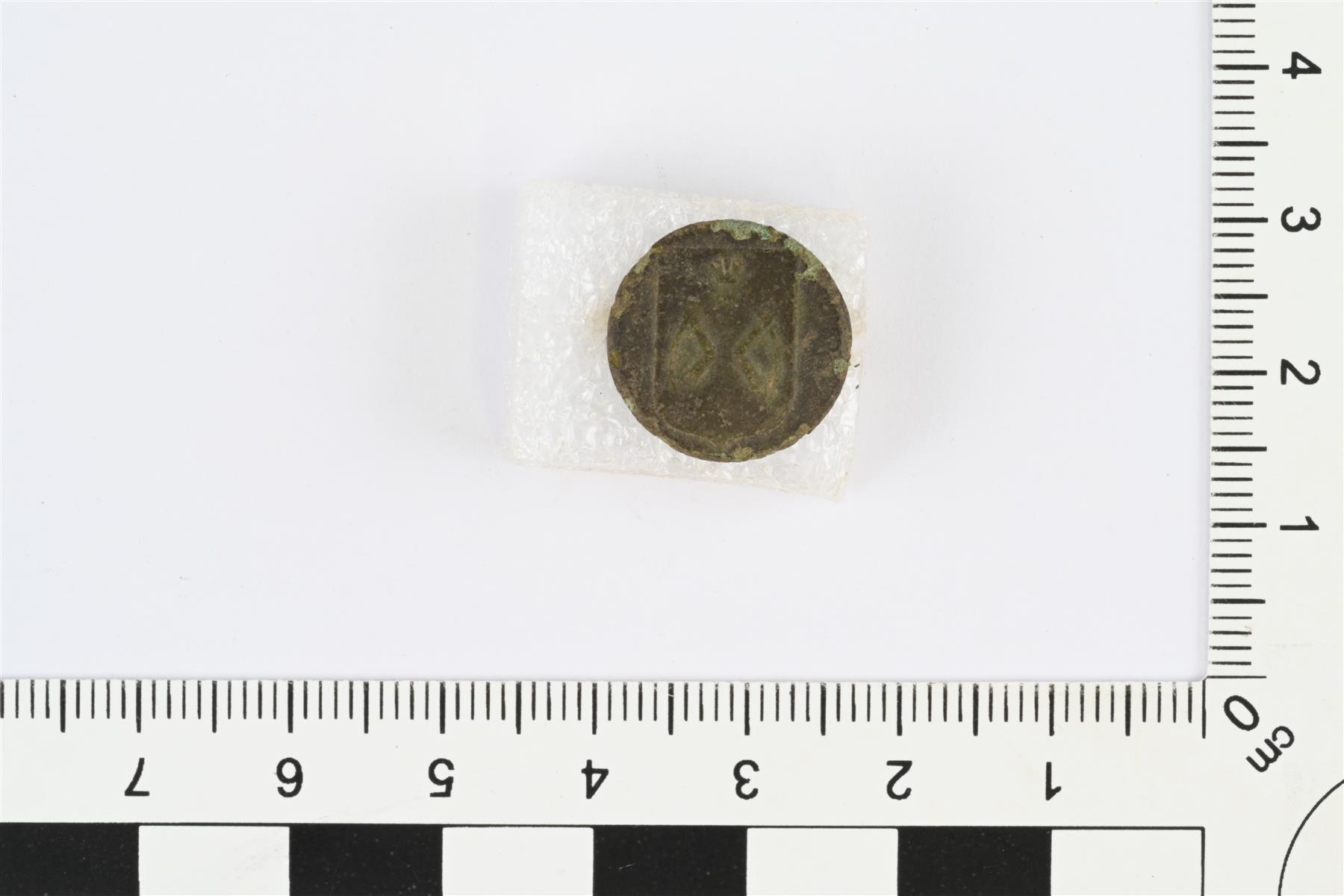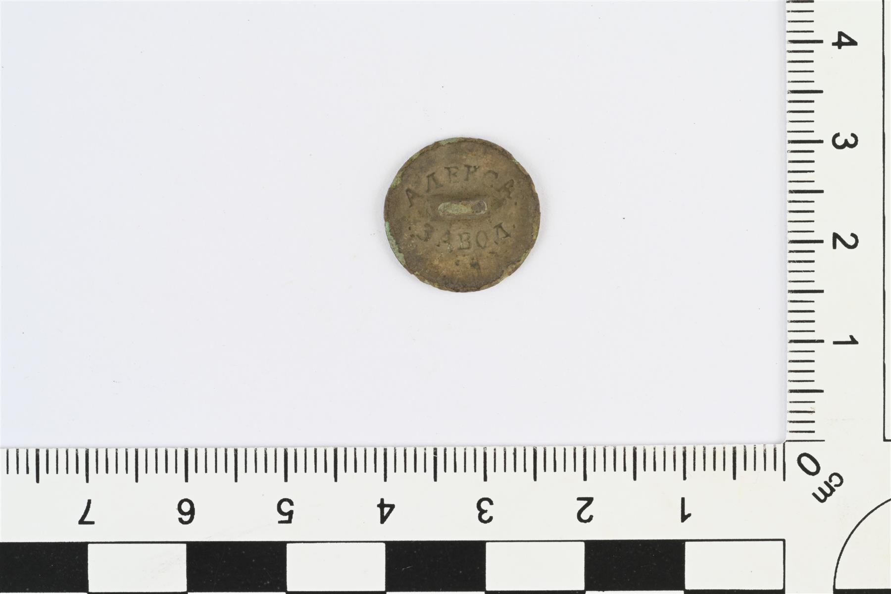 | Litteä nappi, taustapuolella kanta. Etupuolella vaakunakilpi, jossa vastakkain kaksi koukistettua kättä ja niissä käyräsapelit (kuin Karjalan vaakuna, mutta ilman toisen käden suoraa miekkaa) ja niiden yläpuolella pieni kruunu. Taustapuolella tekstiä kyrillisillä kirjaimilla. | |