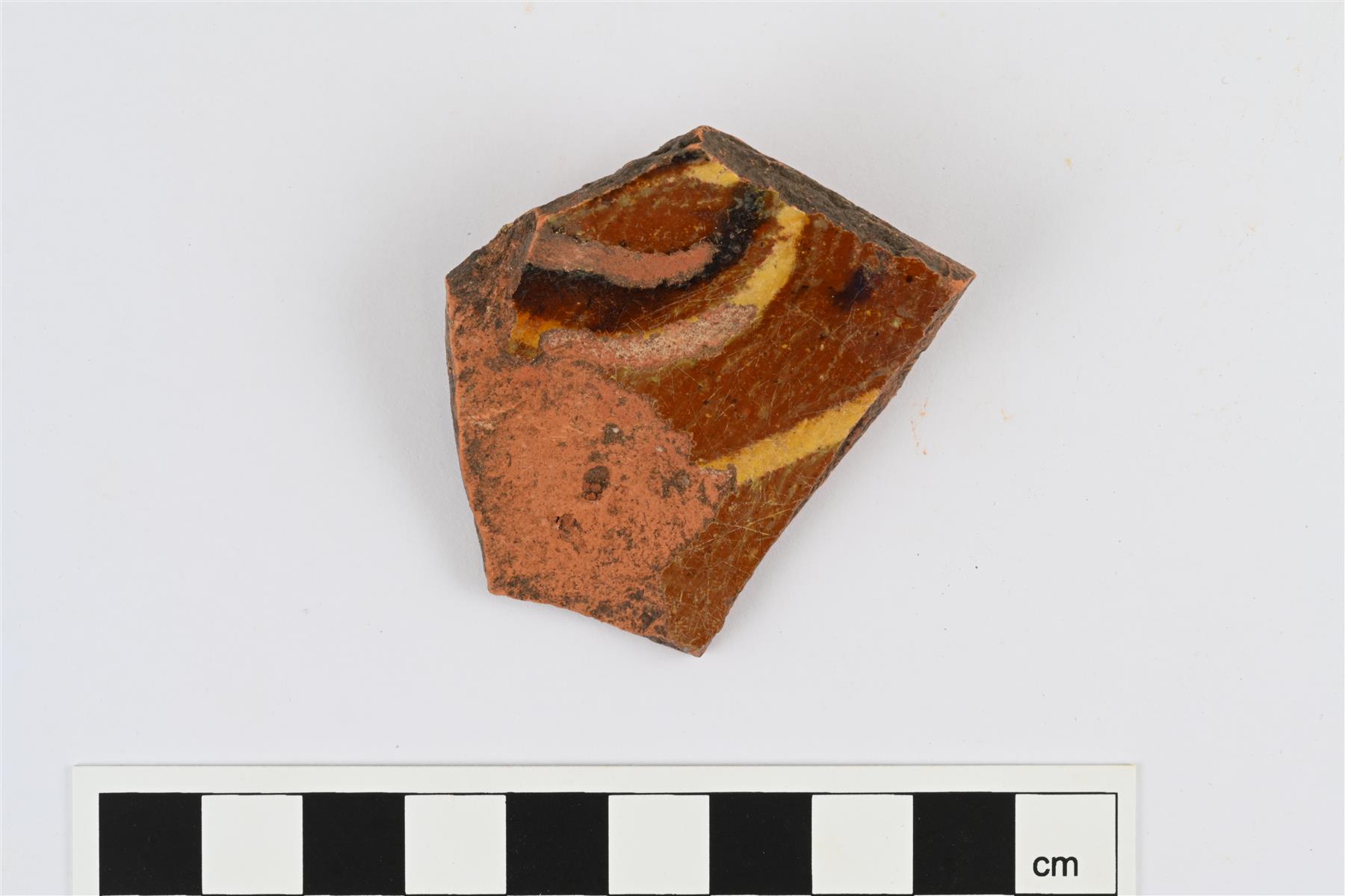 | Valkosavikoristeisen vadin pohjapala. Pohjareuna profiloimaton, kyljen kulma loiva. Sisäpinnalla valkosavella ja ruskealla värillä tehtyjä kuvioita ja väritön lyijylasite. | |