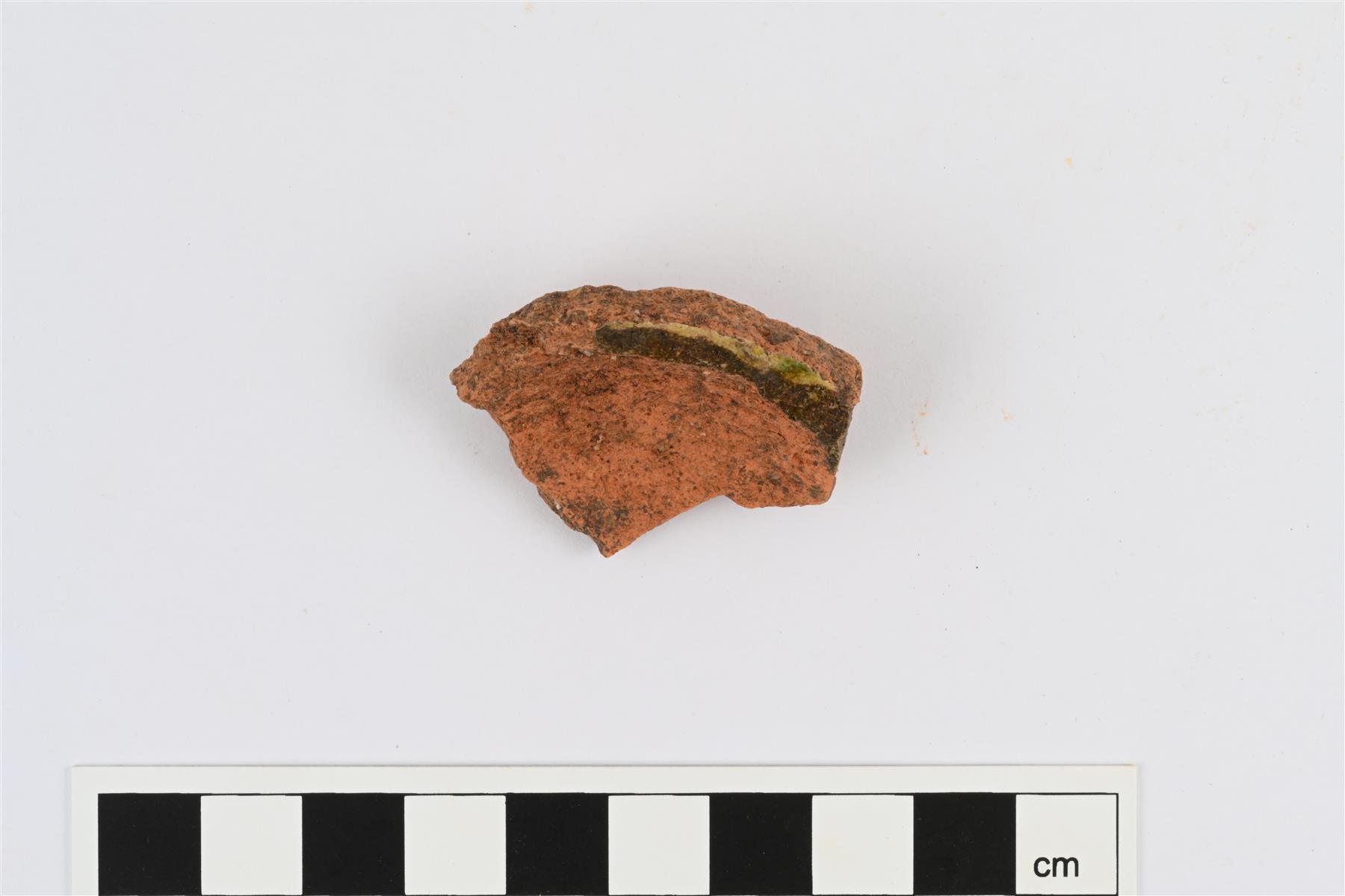 | Valkosavikoristeisen kulhon pohjapala. Pohjareuna kevyesti profiloitu. Sisäpinnalla rippeitä valkosavikuviosta ja vihreästä lyijylasitteesta. | |