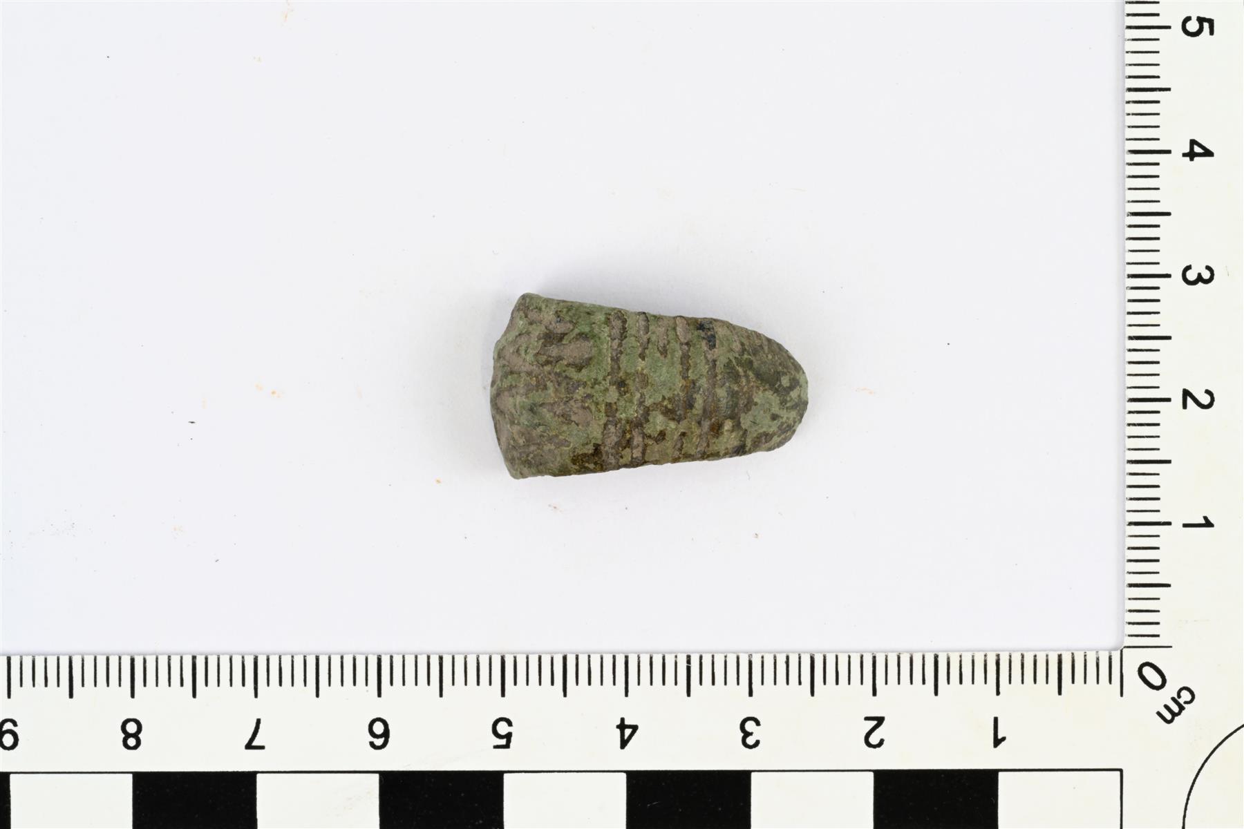 Päihin kapenevan rannerenkaan päätykatkelma. Koristeluna viivauurteita ja kolmiokuoppakuvioita. Etupuoli on kupera ja taustapuoli on koverrettu. Lisäksi taustapuolella on matala harjanne. | |