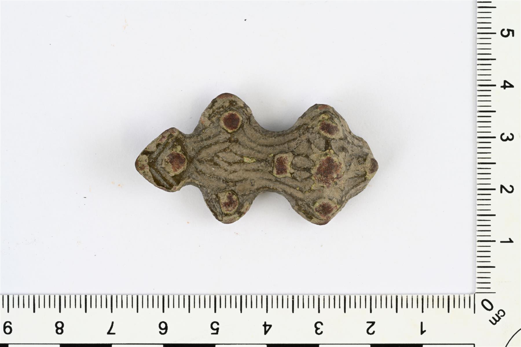 | Tasavartisen soljen katkelma. Toinen pää puuttuu. Koristeluna viivauurteita ja tappeja. Taustapuoli on koverrettu keskiosasta. Päässä on pieni neulakota. Vastaa Kivikosken ryhmän 6 solkia. Vrt. Kivikoski Fig. 12. | |