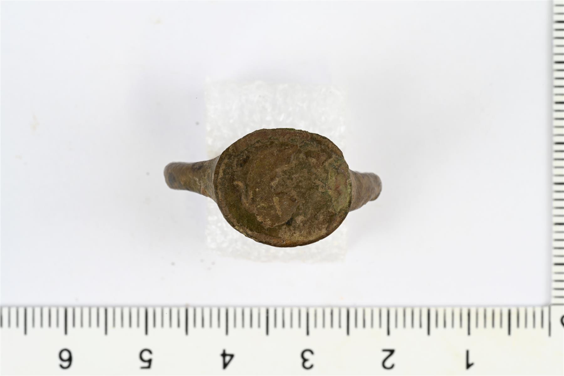 | Kokonaisena säilynyt Sarvas-sormus. Kanta on muodoltaan pyöreä, mutta pinta on kulunut ja koristelua ei voi erottaa. Sisäpinnassa voi erottaa valinsauman kohdan. | |