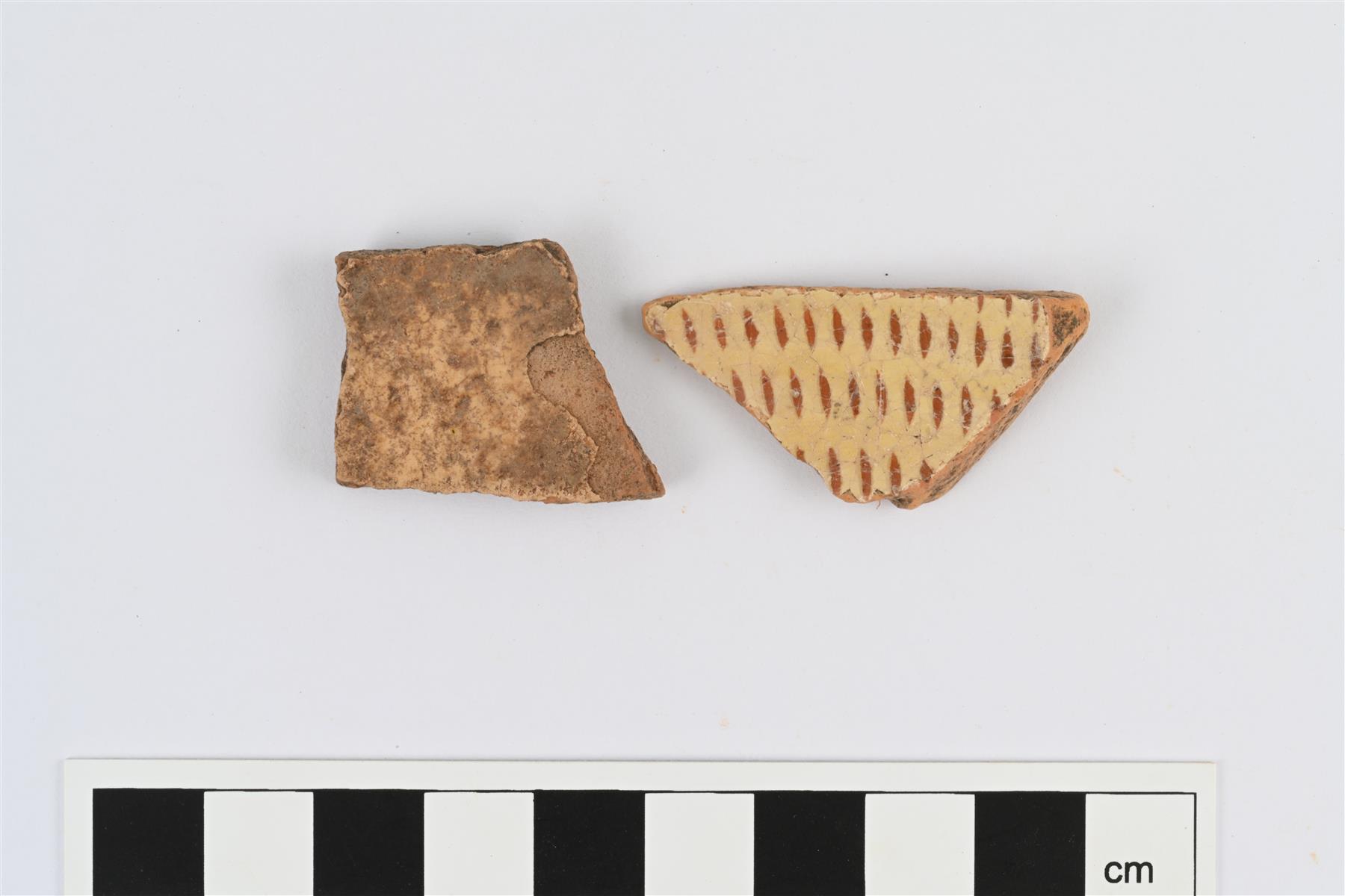 | Valkosavikoristeisia kylkipaloja eri astioista. Sisäpinnalla valkosaviliete, johon uurrettu hemring-koristelua, ja väritön lyijylasite. | |