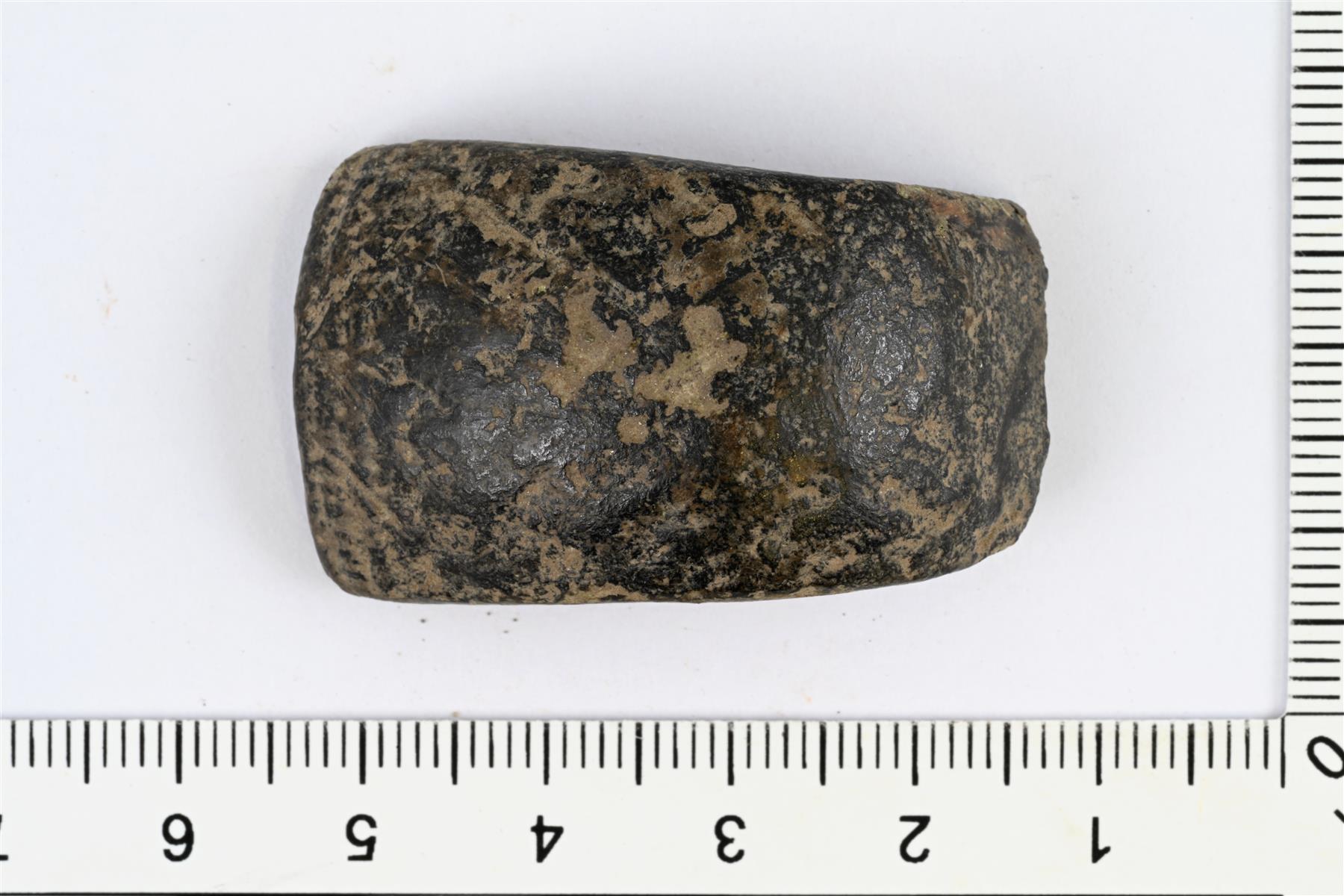 | Päihin levenevän massiivisen rannerenkaan päätykatkelma. Päässä on koristeena helmiviivoja. Pinta on melko kulunut, mutta siinä erottuu myös D:n muotoisen leimojen muodostama koristekenttä. Vrt. Kivikoski Abb. 734. | |