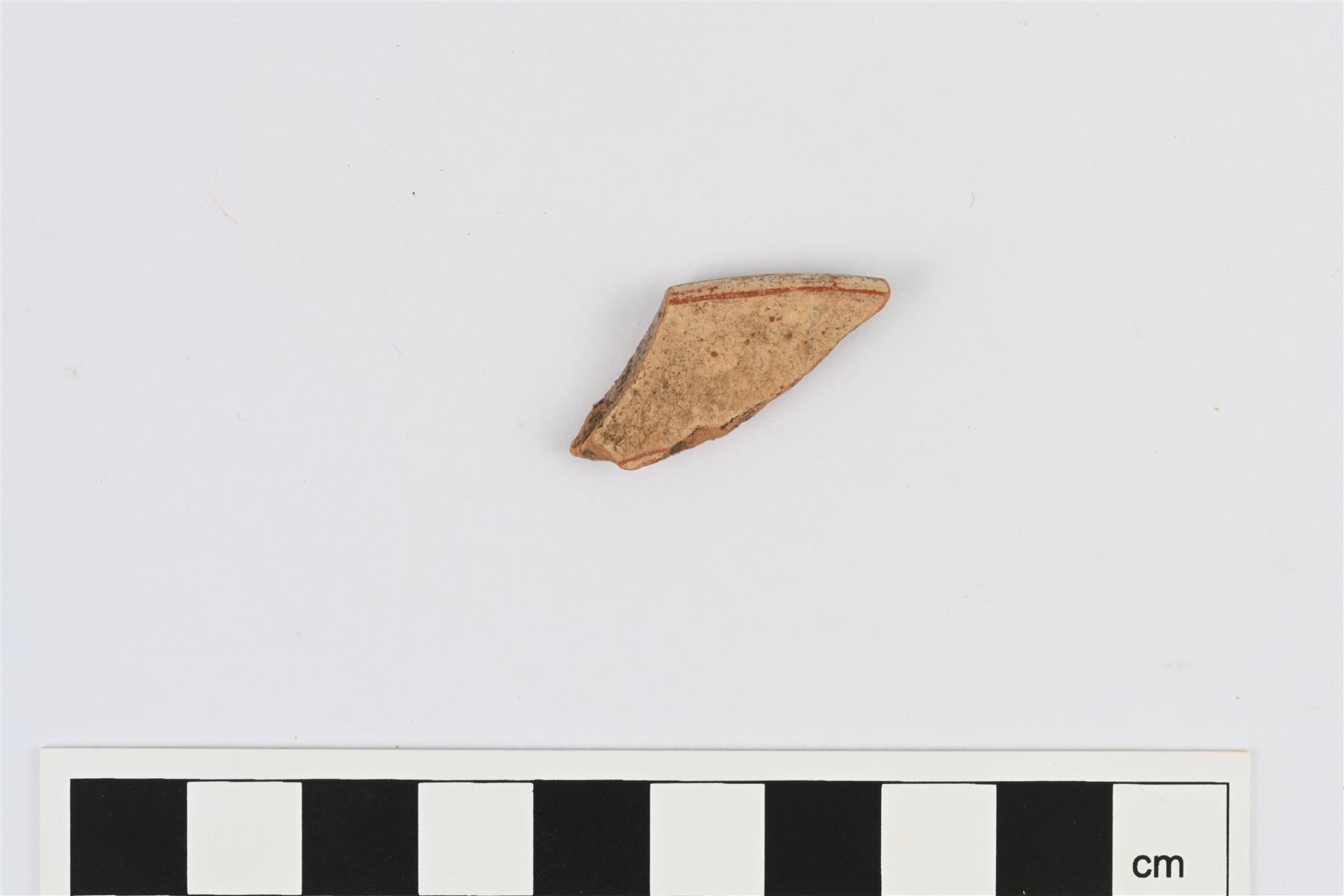 | Engobe-koristeinen suureunapala, luultavasti pienestä vadista tai lautasesta. Sisäpinnalla ja reunan ulkopinnalla valkosaviliete, sisäpinnalla väritön lyijylasite. | |