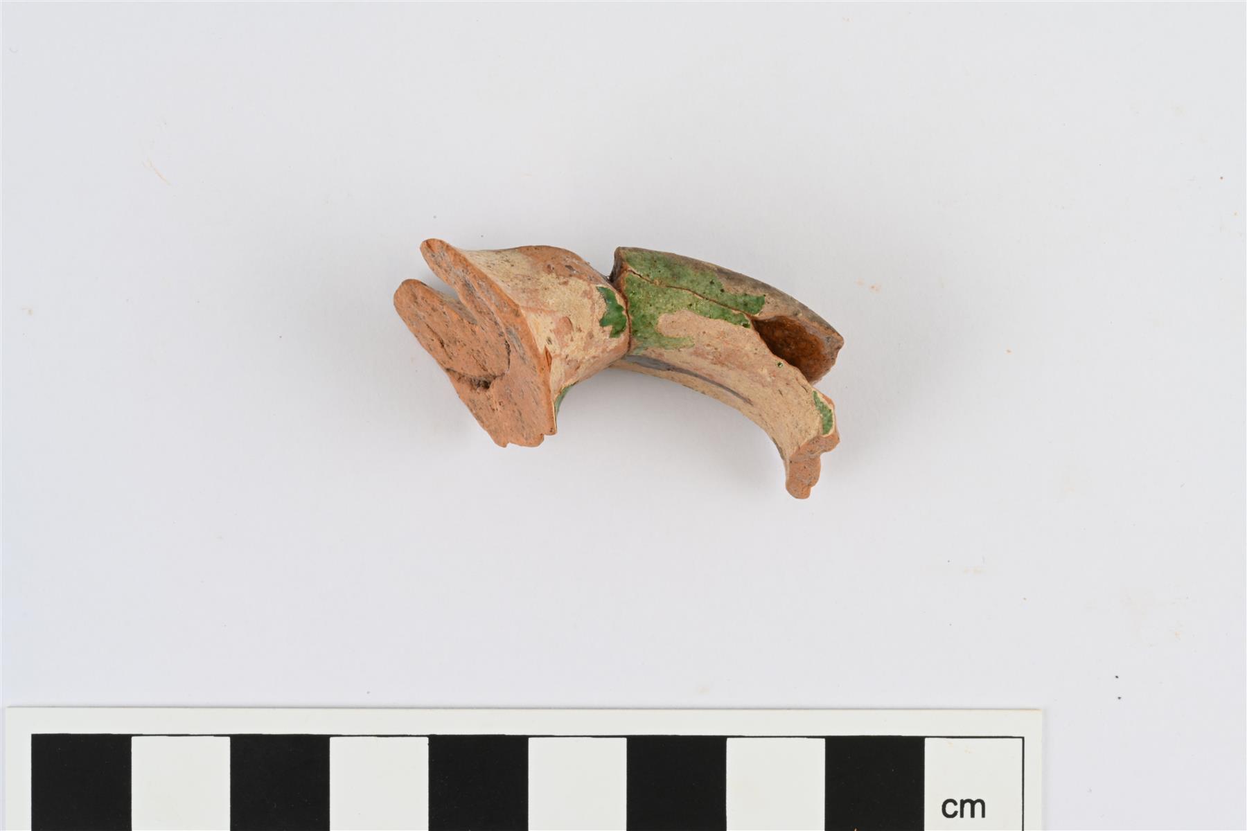 | Engobe-koristeisen korvan yhteensopivia katkelmia, palat liimattu yhteen. Valkosaviliete ja vihreä lyijylasite. | |