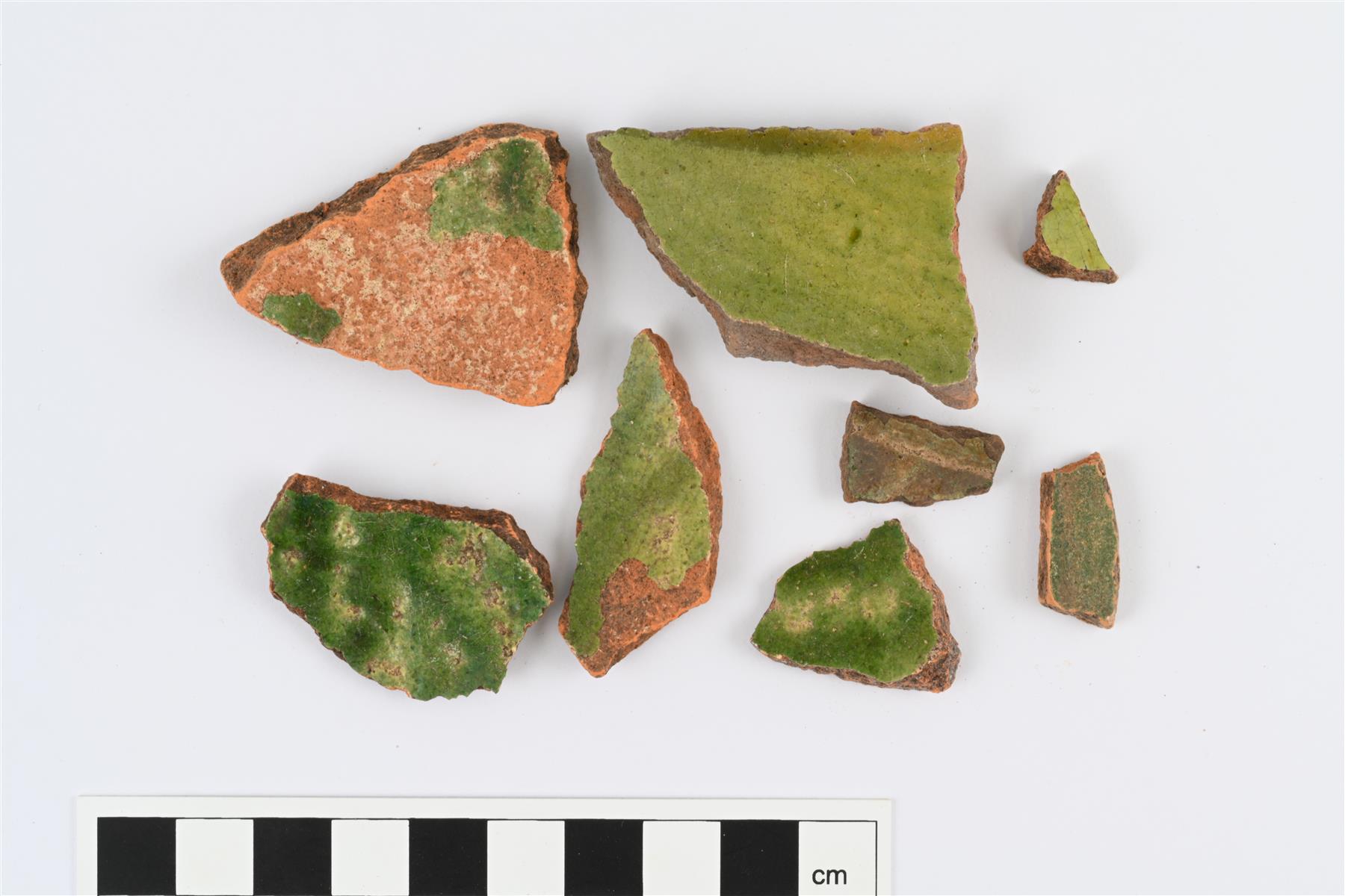 | Engobe-koristeisia kylkipaloja eri astioista. Toisella pinnalla valkosaviliete ja vihreä lyijylasite, toisella pinnalla väritön lyijylasite tai ei lasitetta. | |