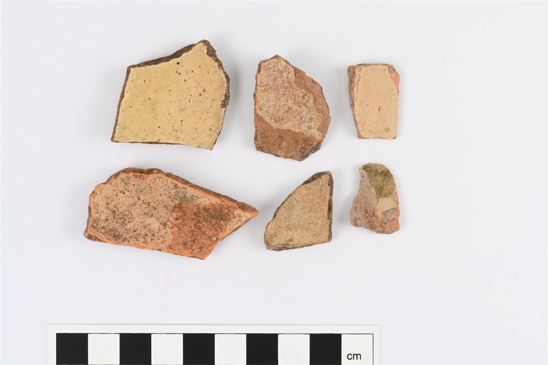 | Engobe-koristeisia kylkipaloja eri astioista. Sisäpinnalla valkosaviliete ja väritön lyijylasite. | |