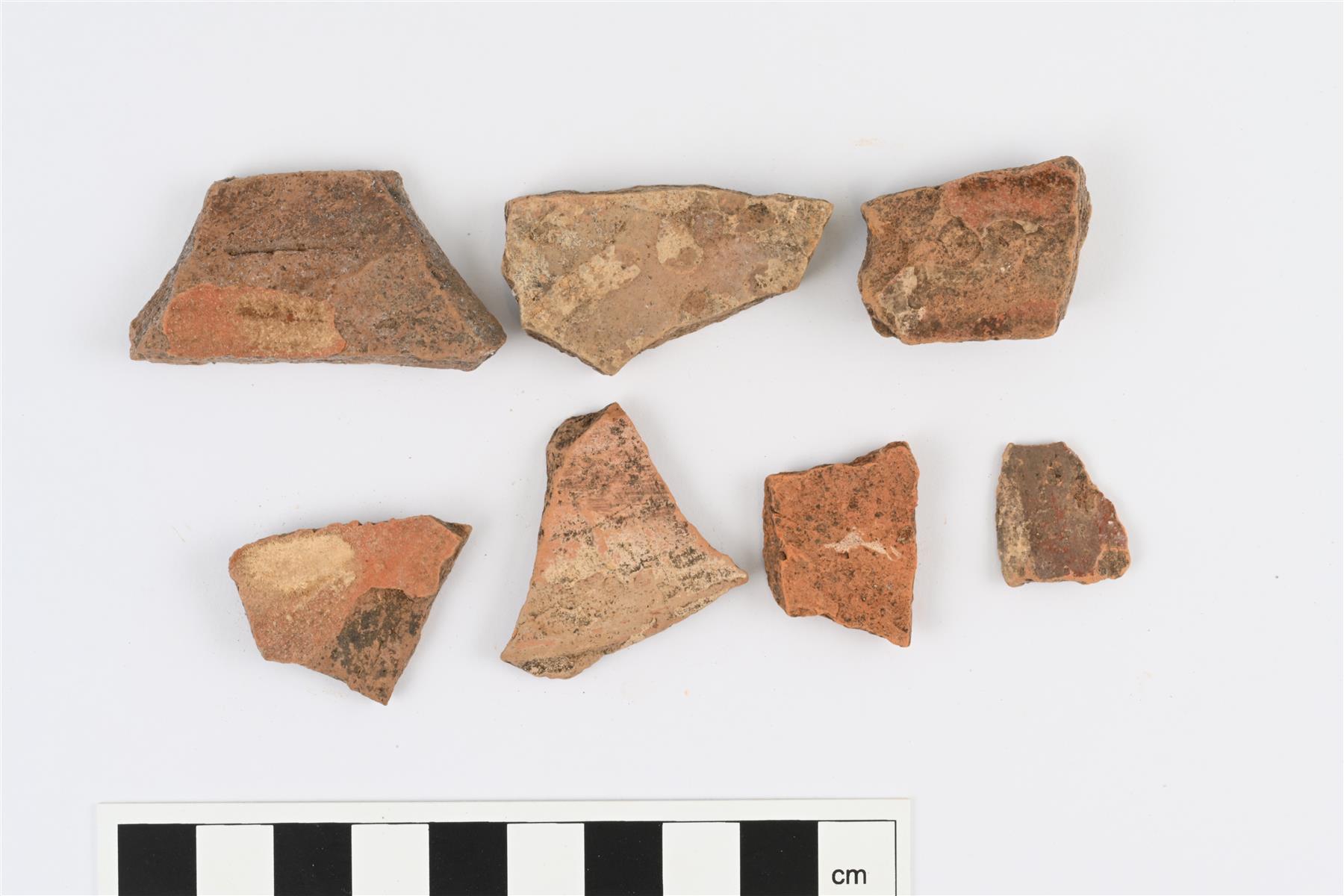 | Punasaviastioiden valkosavikoristeisia kylkipaloja. Heidi Martiskainen 6.6.2024 KM46903:52_1_astian kylki |