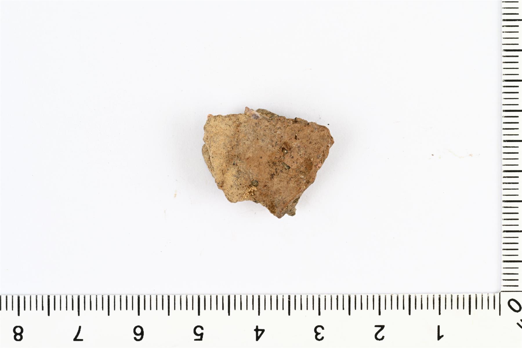 | Pieni kampaleimalla koristeltu saviastian kylkipala. Sisäpinta puuttuu. Sekoitteena maasälpää ja biotiittiä. Raekoko 1-2 mm. Väritys on vaaleanruskea. | |
