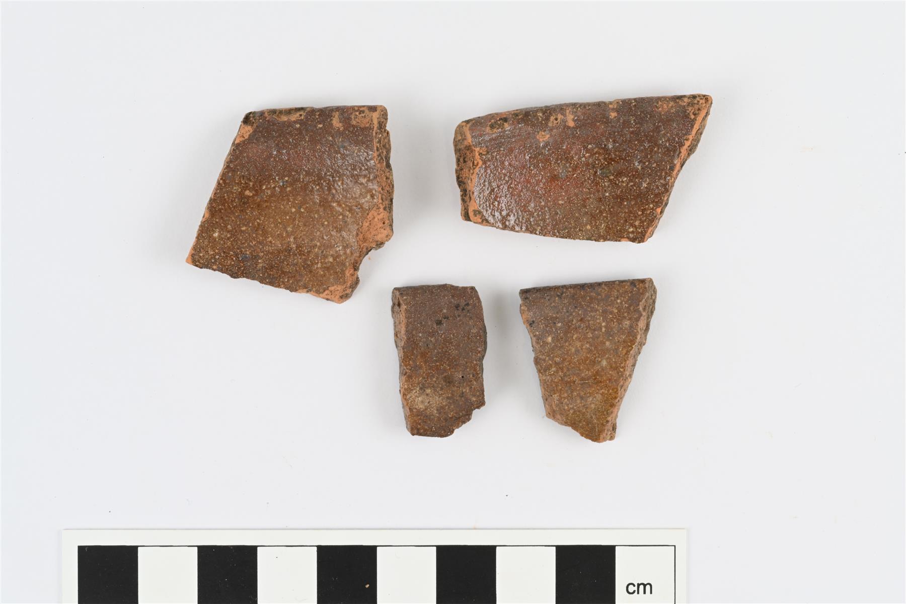 | Ohuita suureunapaloja luultavasti samasta astiasta, kaksi paloista yhteen sopivia. Reunan ulkopinnalla horisontaaleja uria. Sisäpinnalla ruskea lyijylasite. | |