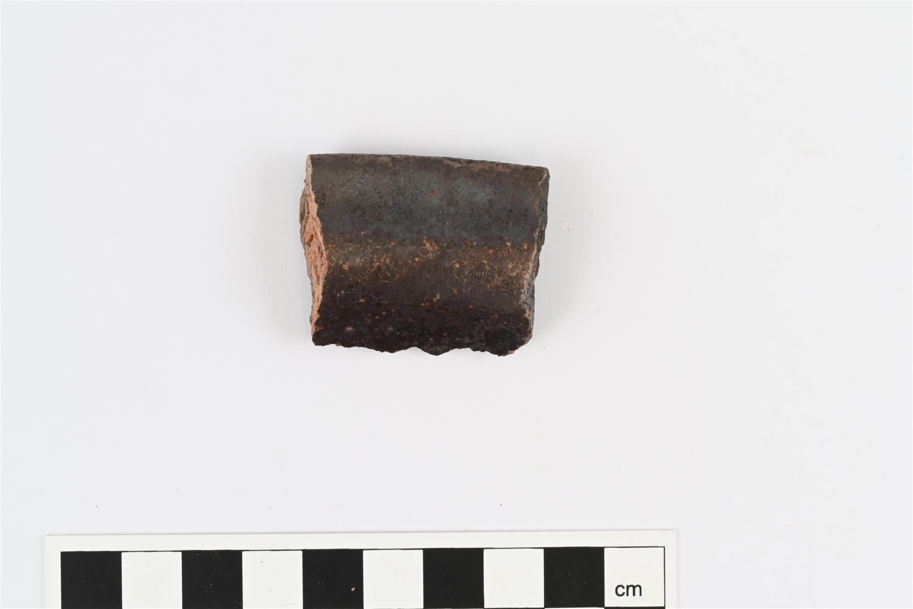 | Kolmijalkapadan tai ruukun suureunapala. Reuna ulospäin taipuva. Sisäpinnalla ruskea lyijylasite. Ulkopinta mustunut. | |
