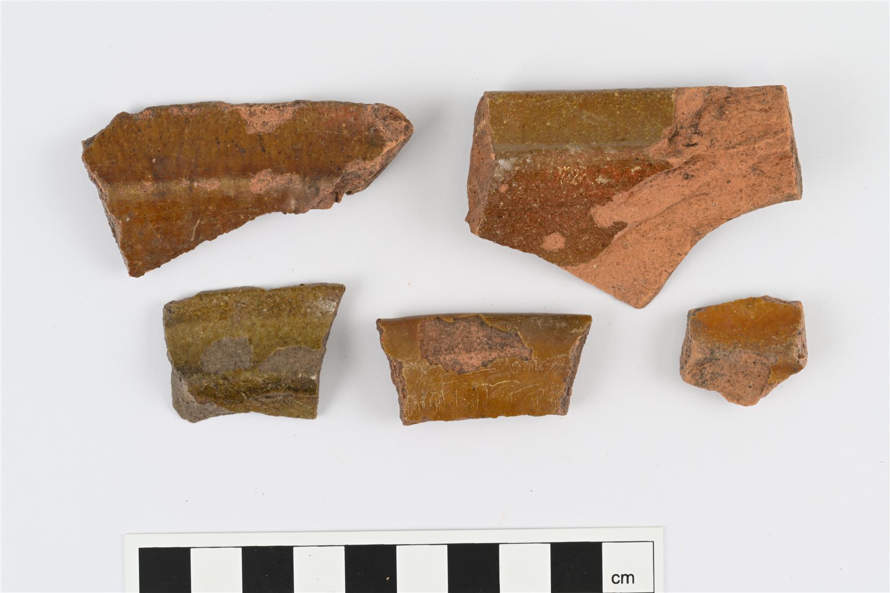 | Kolmijalkapatojen tai ruukkujen suureunapaloja, eri astioista. Reuna ulospäin taipuva ja joissakin paloissa ulkopinnalta profiloitu. Sisäpinnalla väritön tai vihertävä lyijylasite. | |